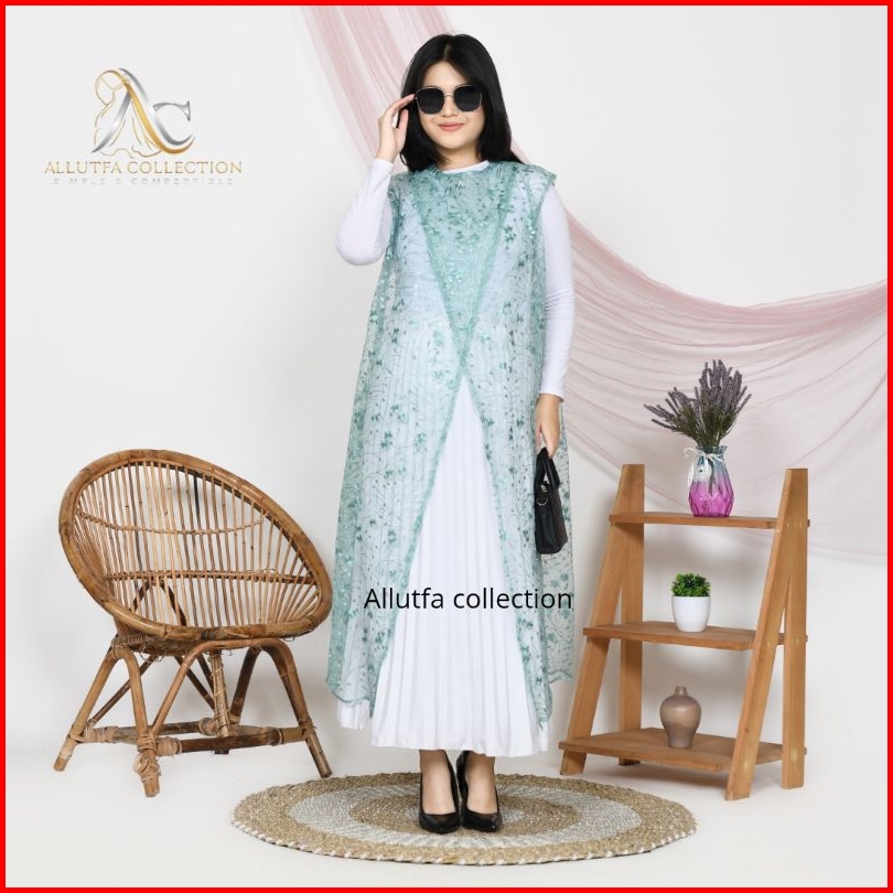 Outer Cardigan Gamis Silang Brokat Tile Mewah Baju Kondangan Wanita Tanpa Lengan Motip Random