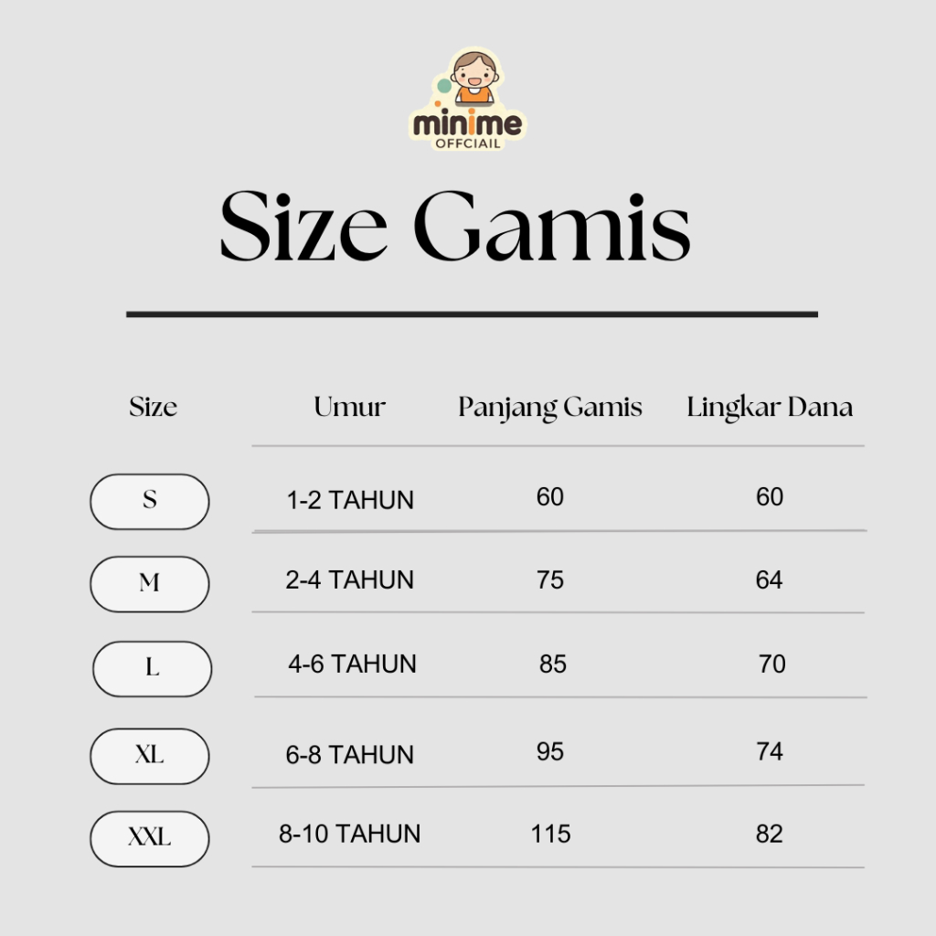 S (1-2 Tahun), M (2-4 Tahun), L (4-6 Tahun), XL (6-8 Tahun), XXL (8-10 Tahun)