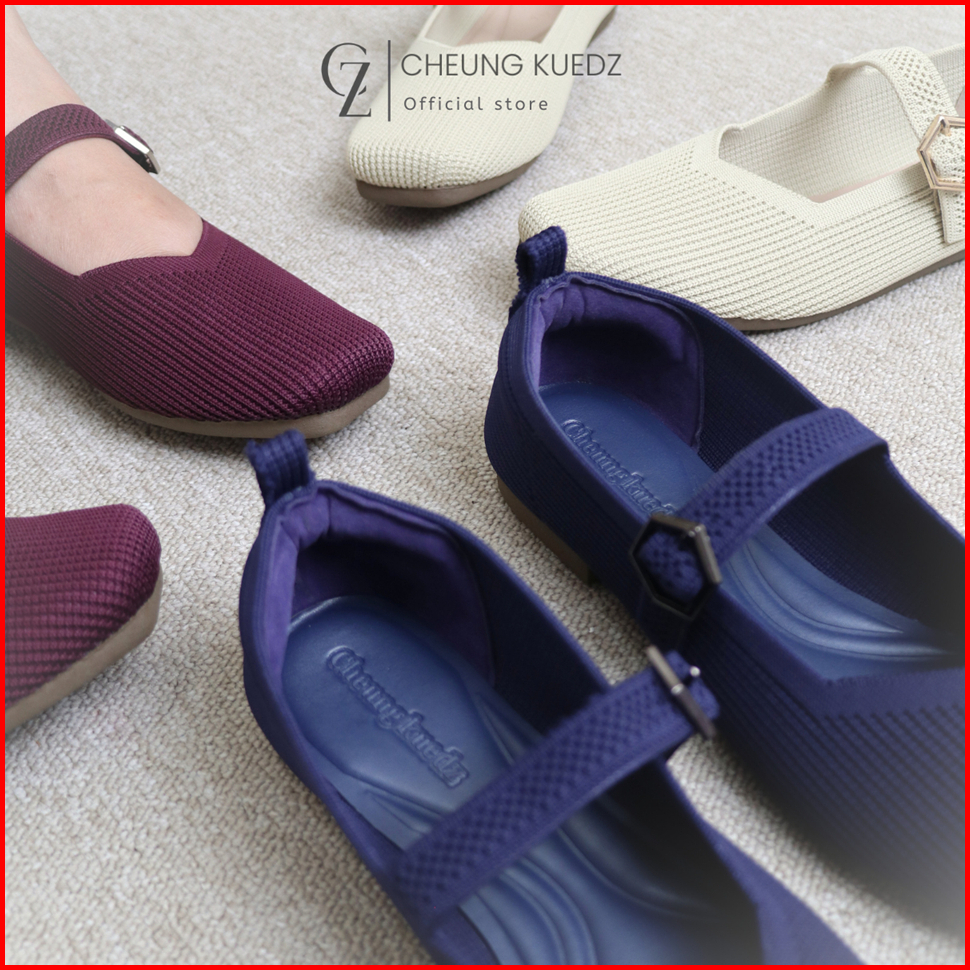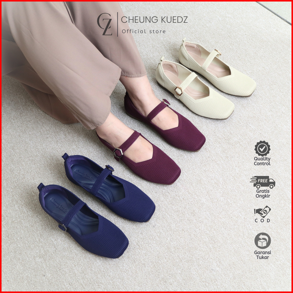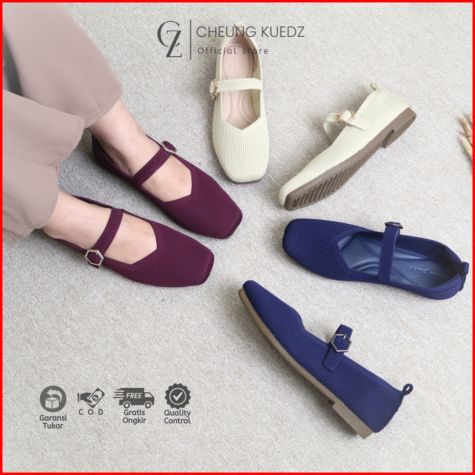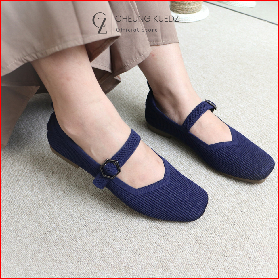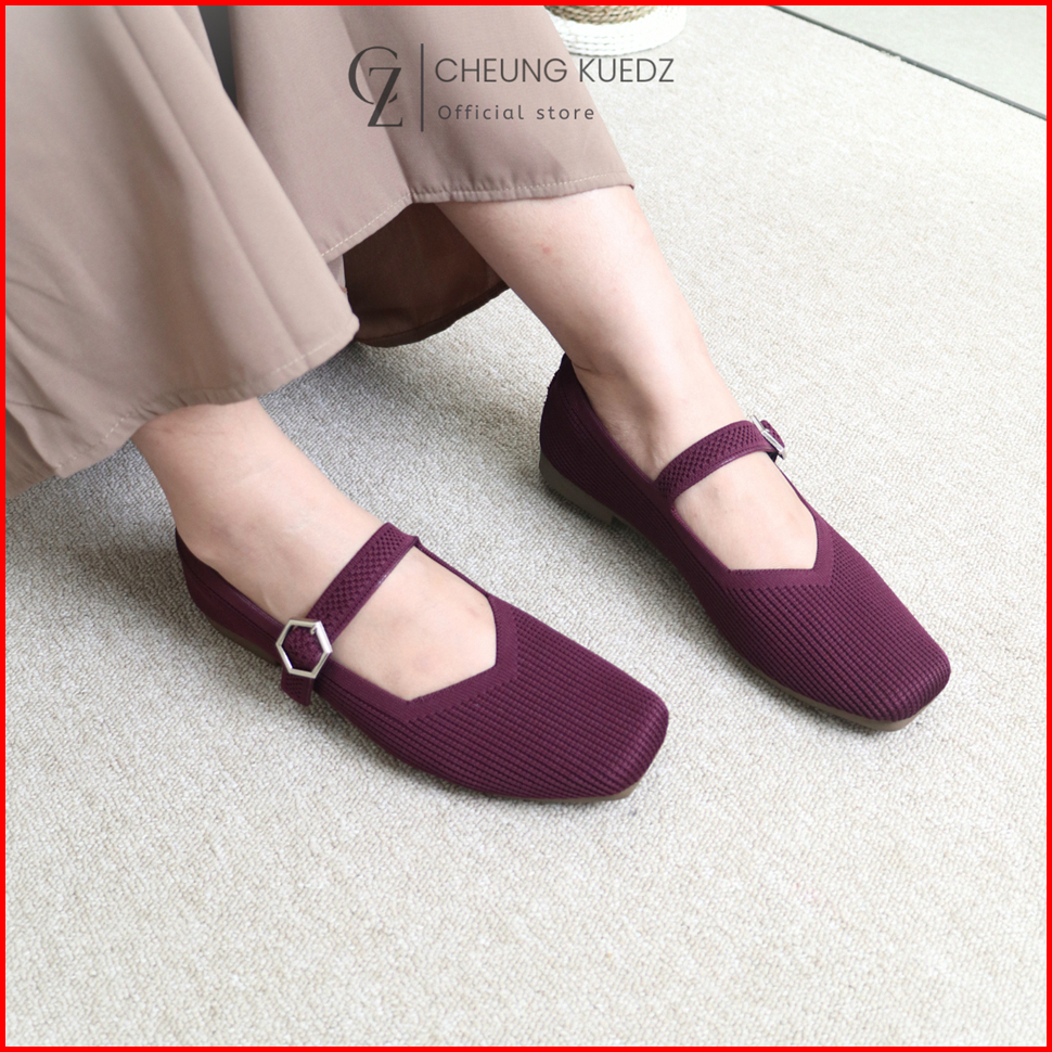 Cheung Kuedz Lousia Flat Shoes Knit Wanita Mary-jane Squere Toe Belt Dengan Desain Elegan Dan Nyaman