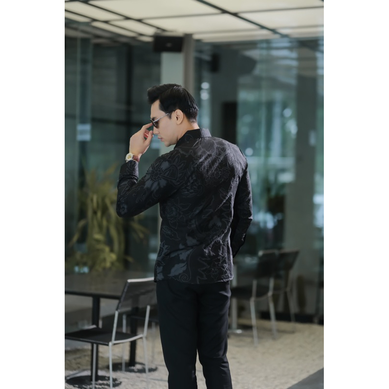 Kemeja Batik Pria Lengan Panjang Hitam Mahkota Abu Bahan Katun Halus Slimfit Outfit Keren Cowok
