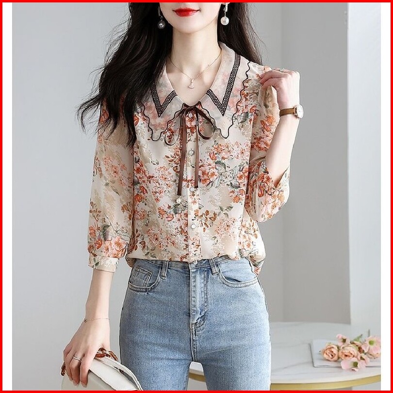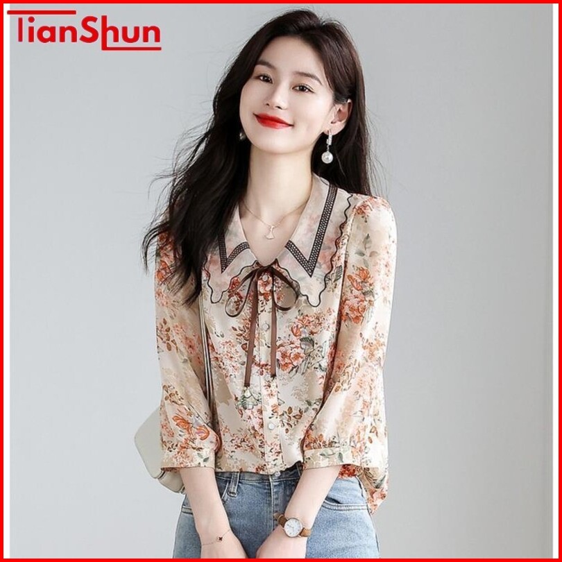 Tianshun Floral Chiffon Shirt Korean Fashion 3 4 Sleeves Ruffled Doll Collar Top Casual Women