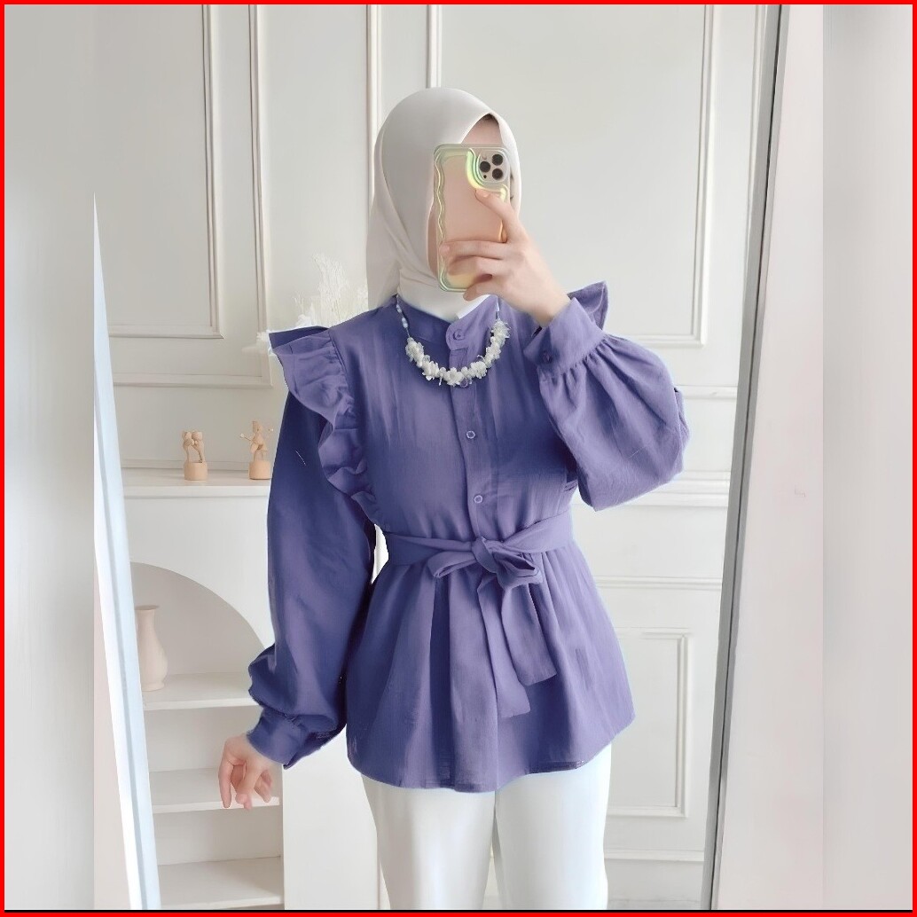 Kemeja Blouse Atasan Wanita Model Melda Polos Motif Rempel Belt Sabuk Lengan Panjang Bahan Crinkle