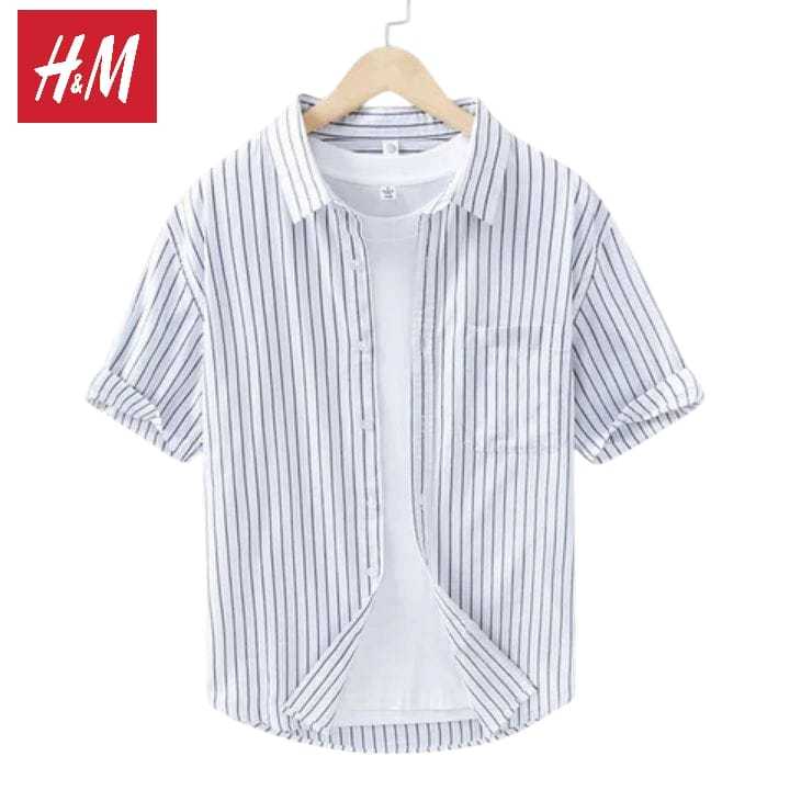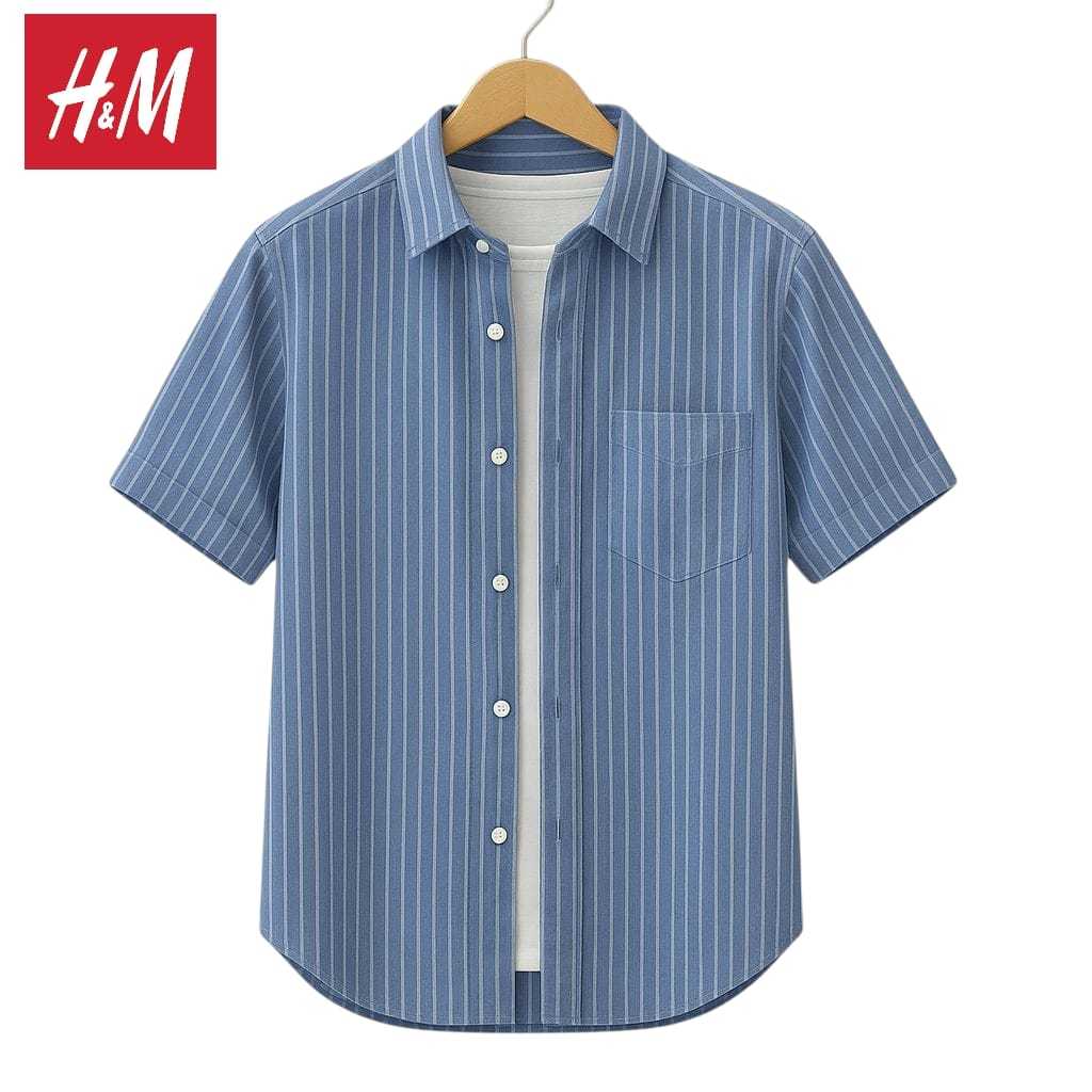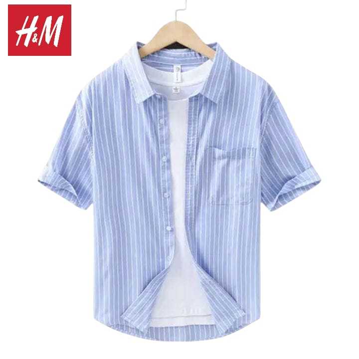 Kemeja Pria Lengan Pendek Motif Garis Salur Stripe Casual Slimfit Slimfit Katun Premium