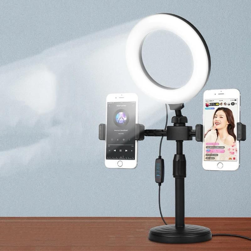 Tripod 28CM + 2 Holder HP + Lampu Ringligth 16CM Stand HP Selfie Vlogging Podcast Review Live Nonton