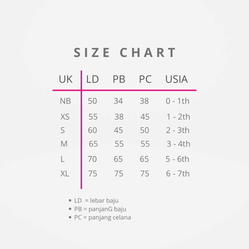 NB : 0-10bln, XS : 1-1,5th, S : 2-3th, M : 3-4th, L : 5-6th, XL : 6-7th, XXL : 8-9th
