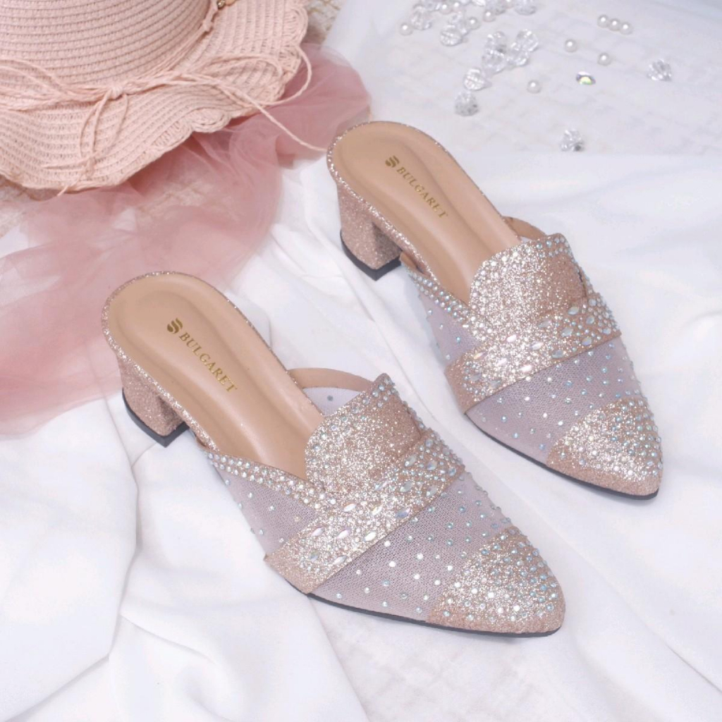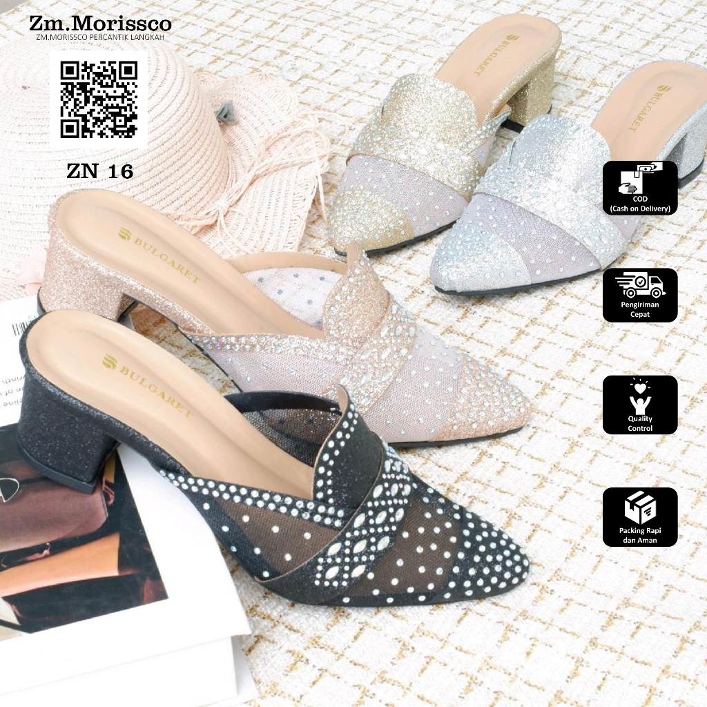 Heels Pesta Gliter Mewah Terbaru Tinggi 5cm ZN16 Square Toe Shoes Karet Wanita
