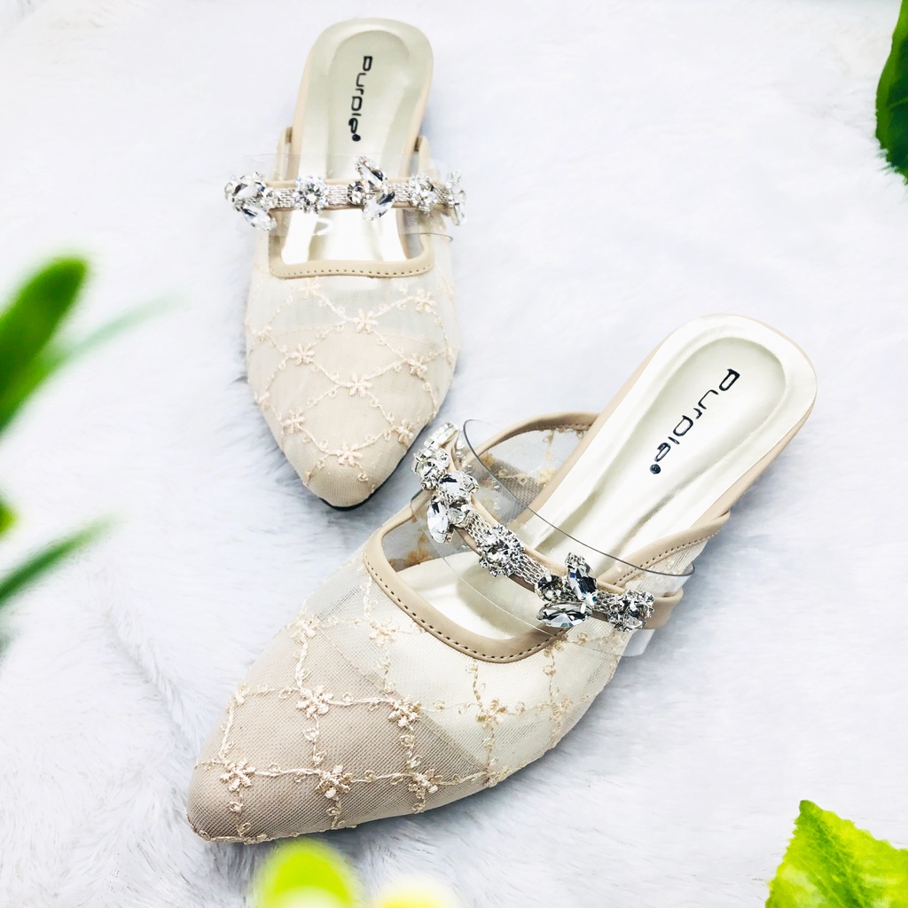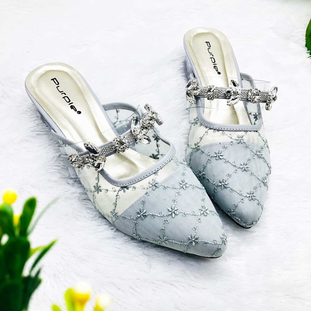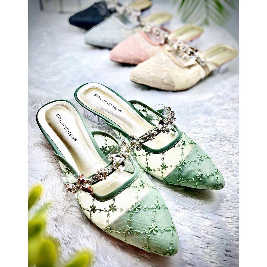 sepatu heels pesta brukat wanita model permata rantai oriana 5cm tahu kaca by purple shoes