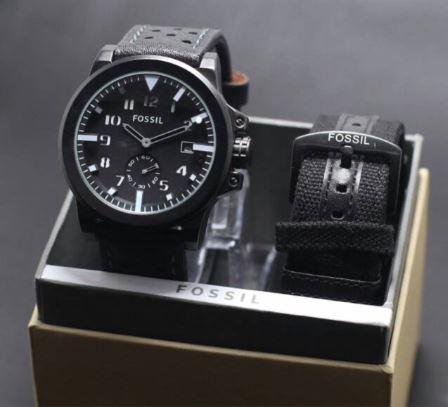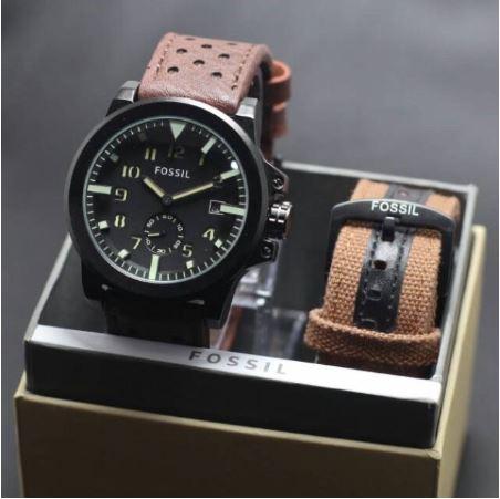 [Star] jam tangan pria super premium fosil paket free tali kulit cadangan - HITAM ABU