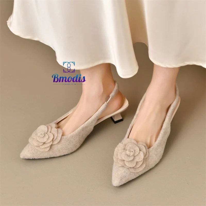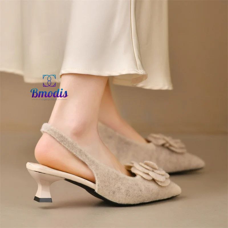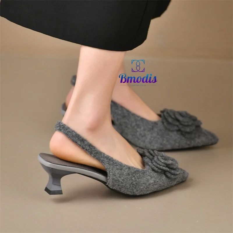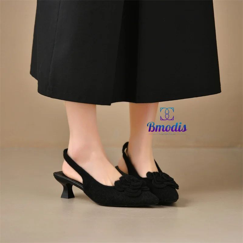 R22 Heels Wanita Fashion Sepatu Hak Motif Bunga Bahan Suede Bisa (With Box)