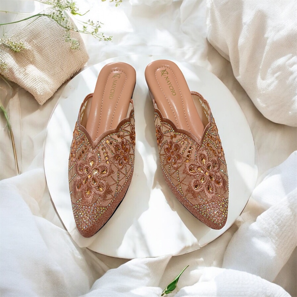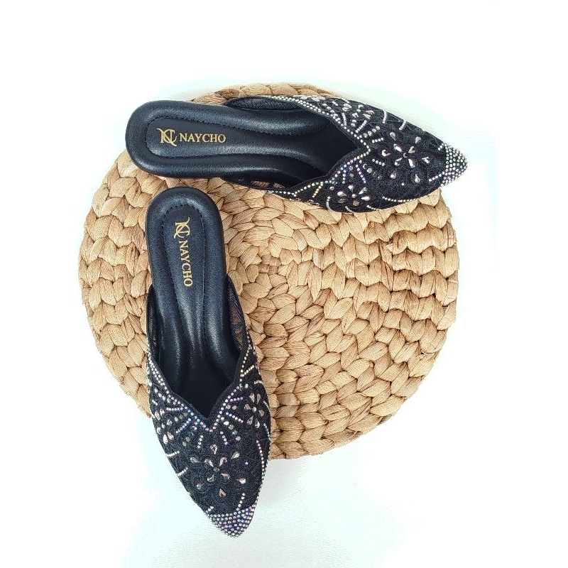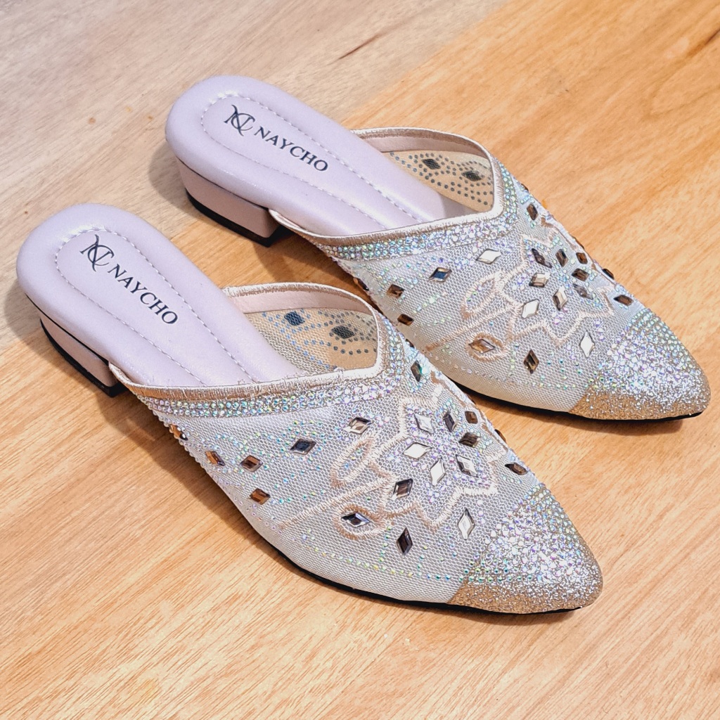 Sepatu Sandal Kondangan Wanita Brukat Import Hak 3 cm Mules Pesta Pengantin Mutiara Payet