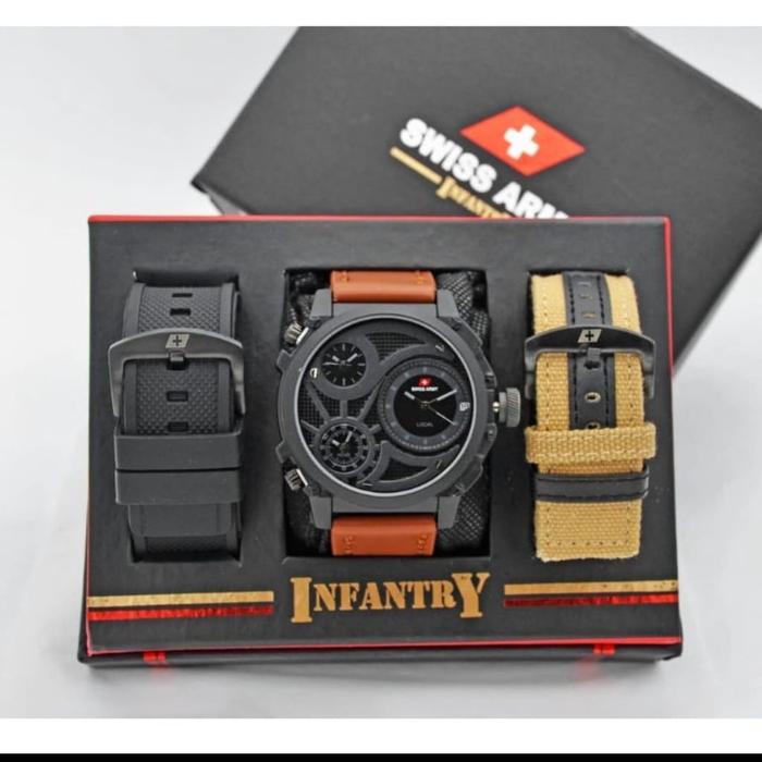 [Star] Jam Tangan Pria Infanty Paket Free 2 Tali Kanvas Kulit Watches - HITAM