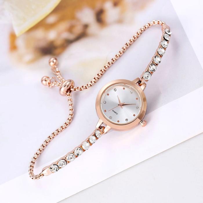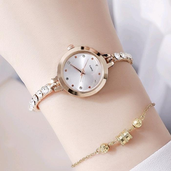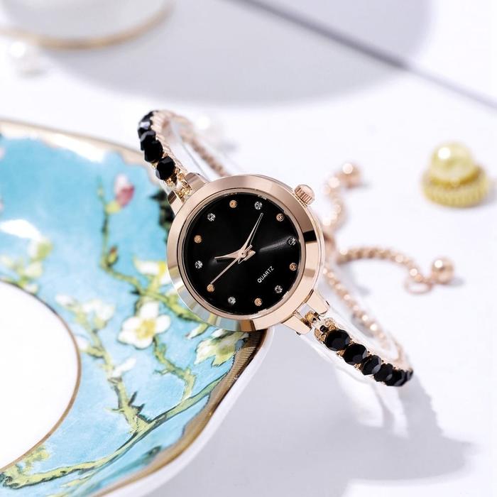[Star] jam tangan wanita mode serut bulat stainless stell free batrai cadangan Watches gelang - hitam