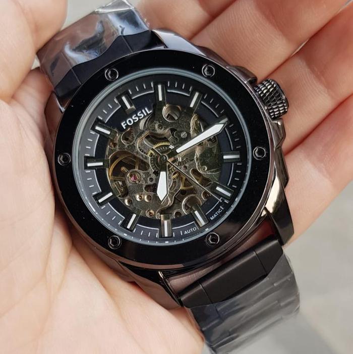 [Star] Jam tangan pria fossil otomatis transparan fossil skeleton - Hitam