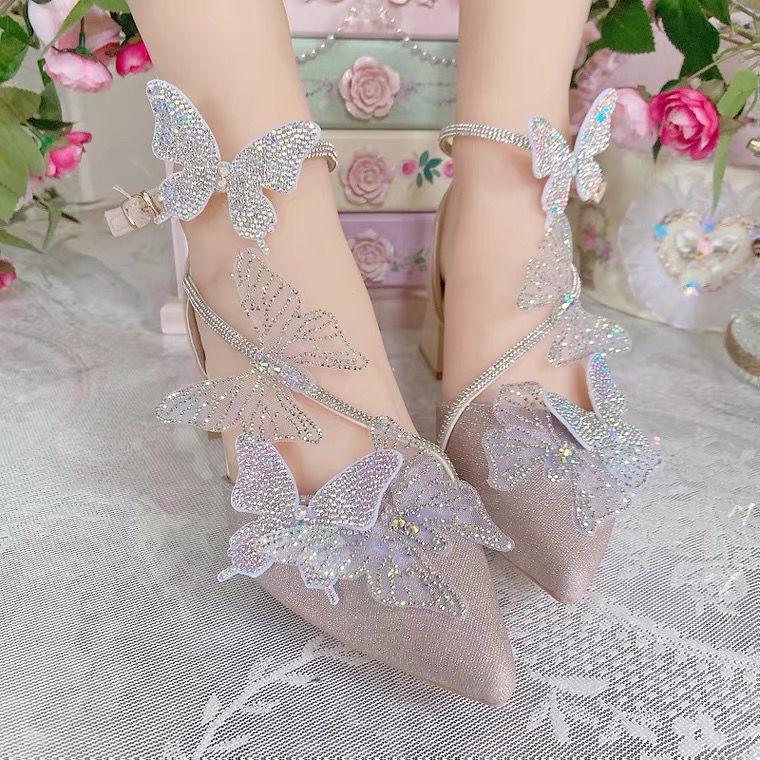 Design Apricot Butterfly Water Diamond Fairy Princess High Heel Shoes with Pointed Ends and Versatile Thick Heel Shoes