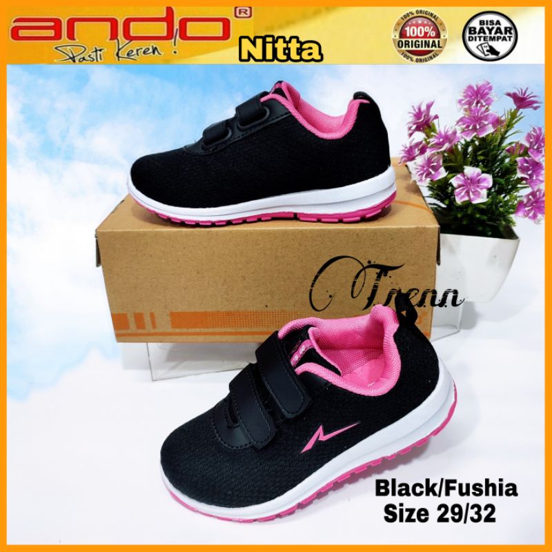 ANDO Sepatu Sekolah Anak Perempuan Cewek Kecil Hitam Pink Rebecca Original Perekat Size 29 sd 36