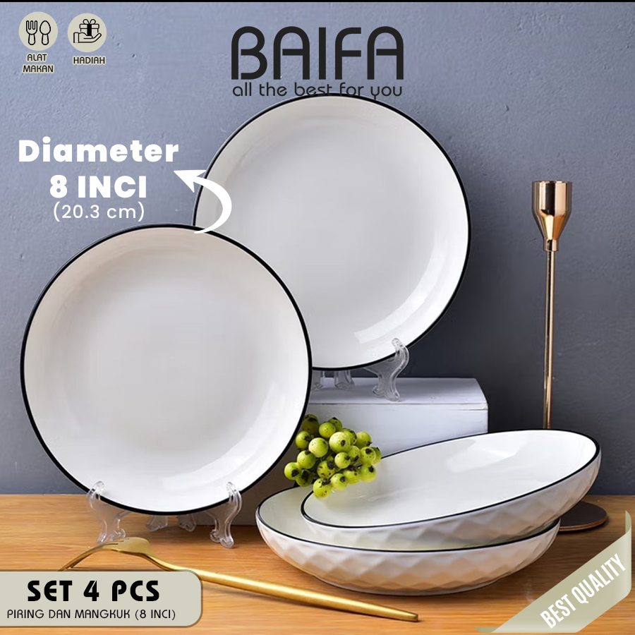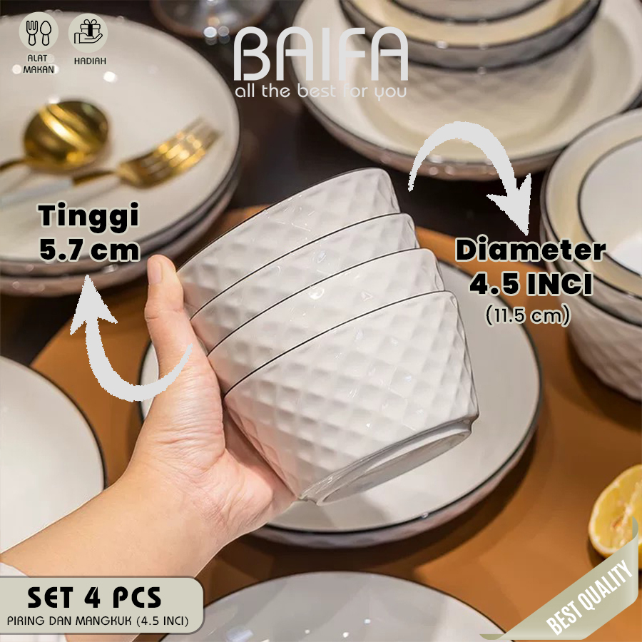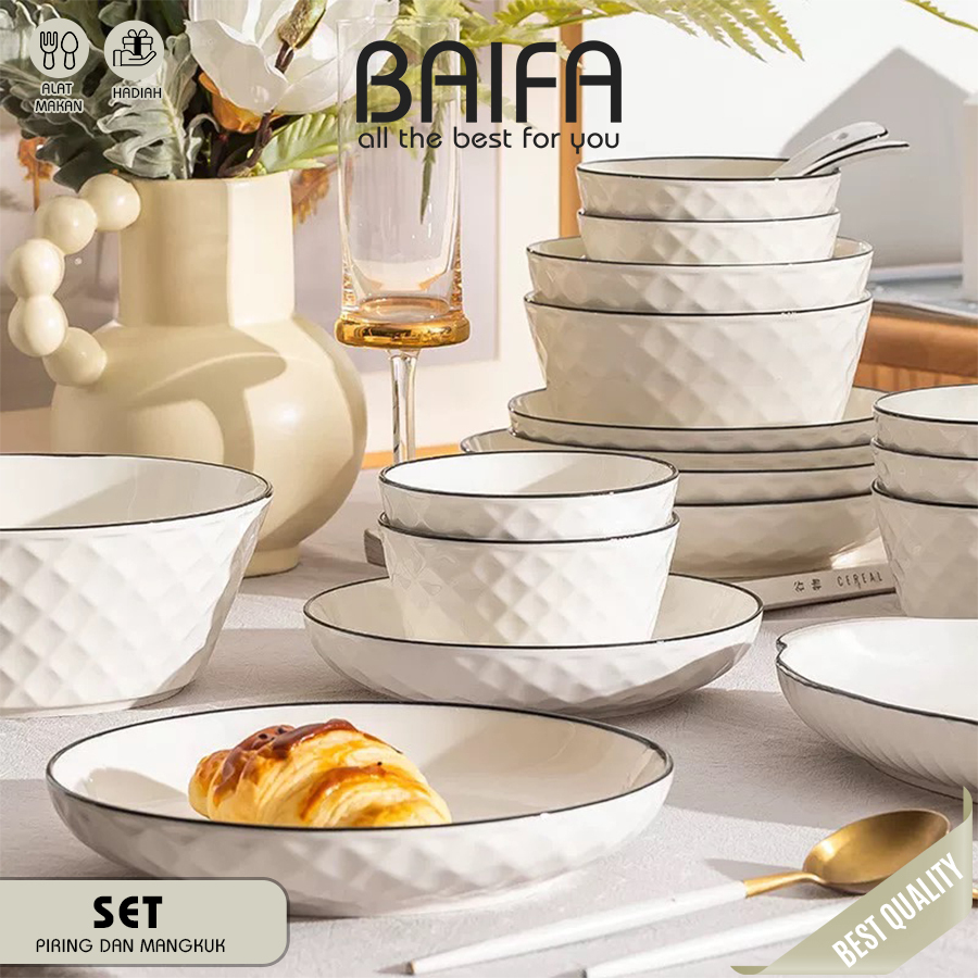 BAIFA - SET 6 Piring & Mangkuk Makan Keramik Putih List Hitam Elegant / Piring Dinner Plate Style Diamond Pattern Murah