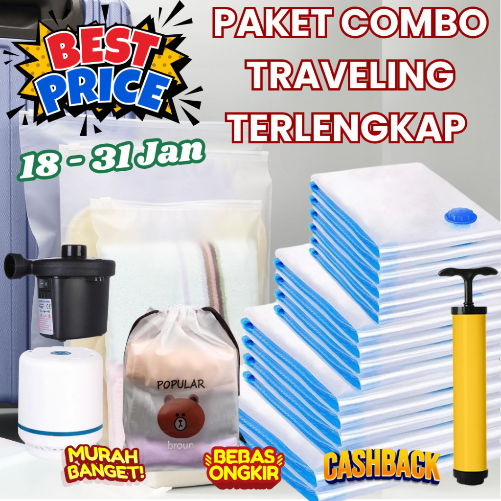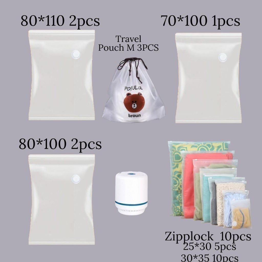 Paket Traveling 10 Plastik Vacuum Vakum Baju Vacuum Bag + NEW Pompa Angin listrik Travel Bag