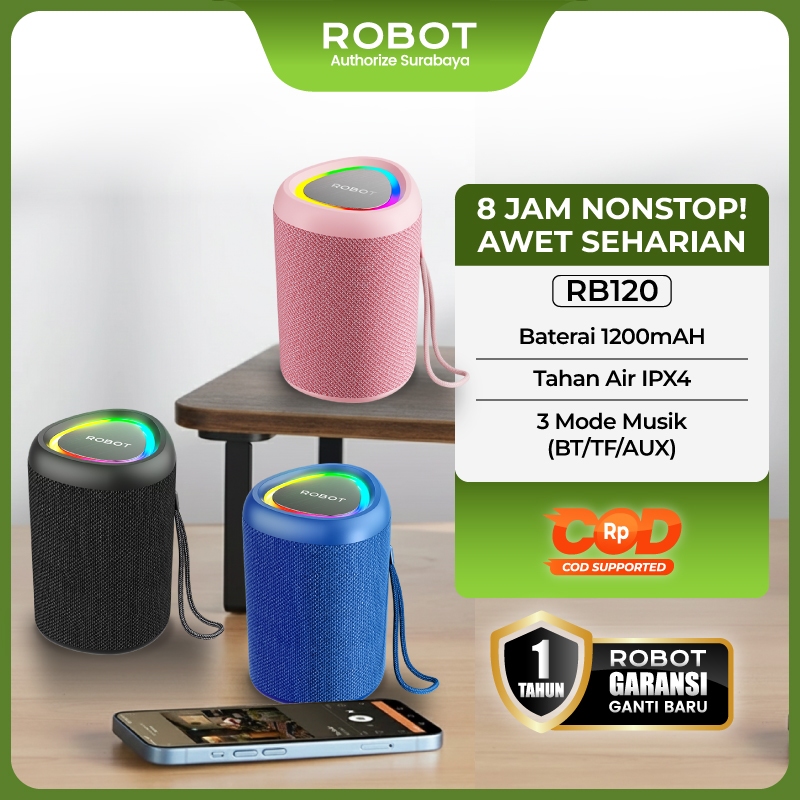 ROBOT Speaker Bluetooth Portable Mini 5W Bass IPX4 Waterproof 1200mAH 8 Jam Playtime RGB LED TWS Stereo TF Card AUX Wireless Speaker RB120