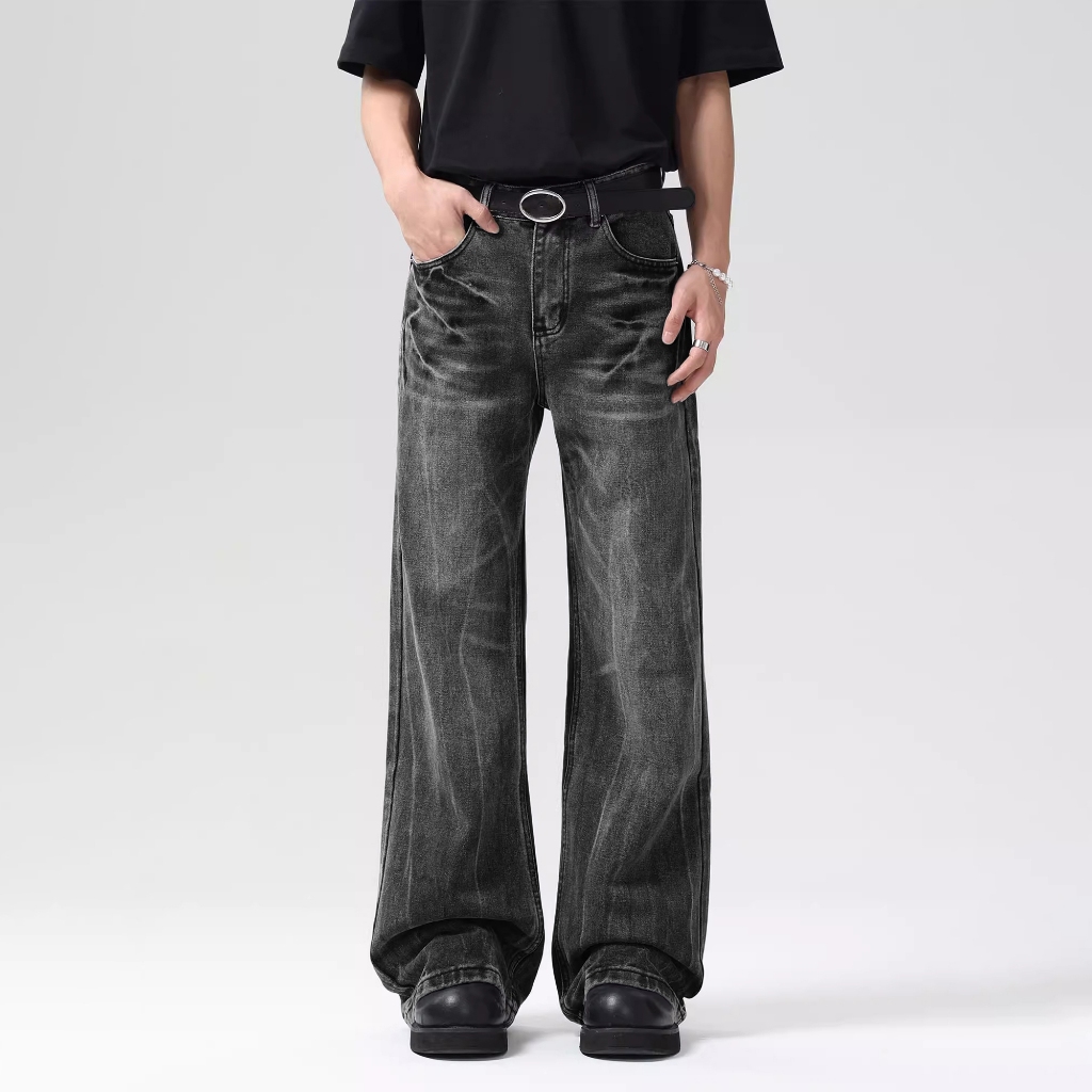 Celana Jeans Pria Hitam Washed - Retro Amerika Motif Petir & Cut Boot