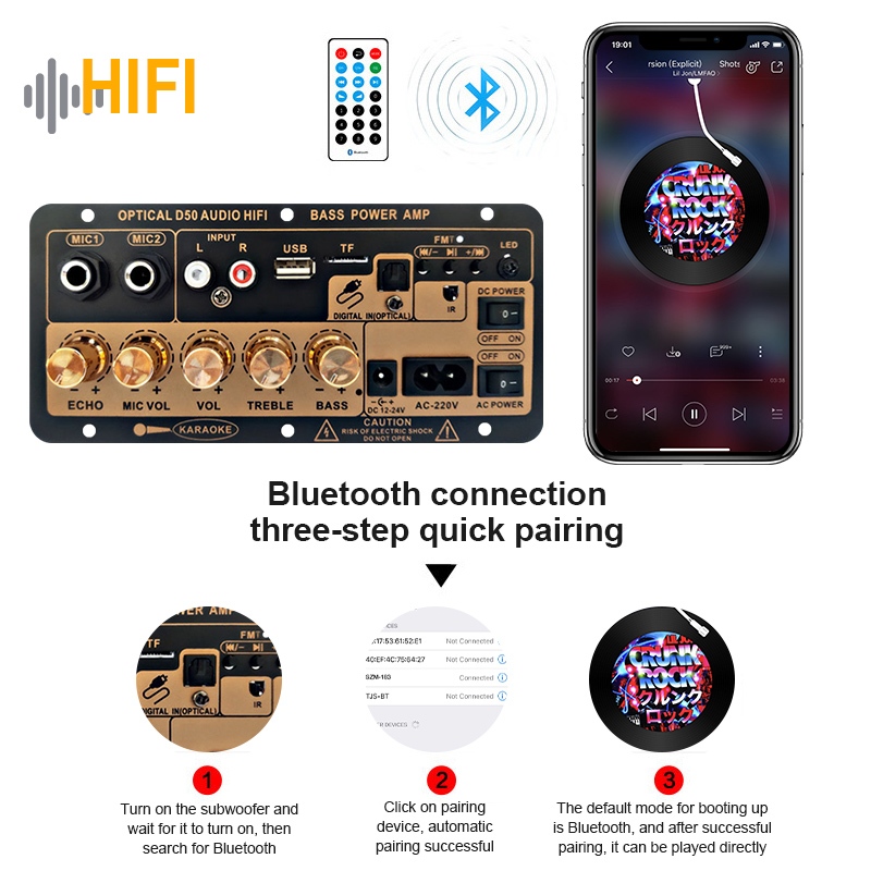D50 Amplifier board Tampilan digital Power amplifier board Untuk 8-12 Inci Speaker AC 220V-DC 12V-24V Bluetooth 5.0 Karaoke Audio Bluetooth USB FM Radio Player Subwoofer -BELL