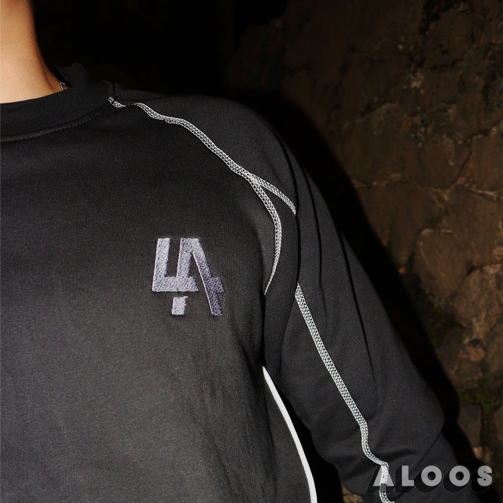 Aloos Crewneck Overdeck + White Line Black Charcoal | Sweater Bordir Kombinasi Katun Fleece 280 Gsm