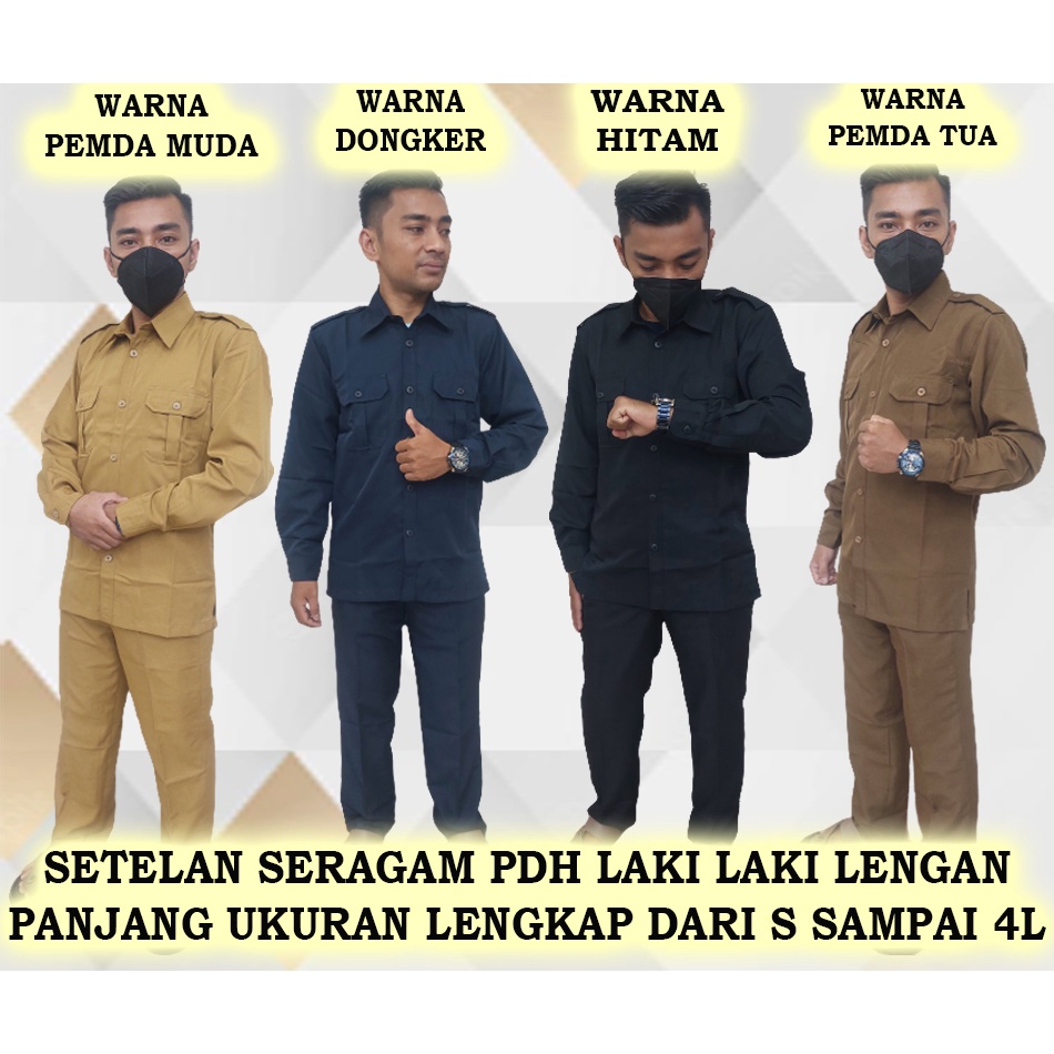 setelan baju dinas PDH laki-laki lengan panjang warna pemda tua-pemda muda-dongker-hitam ukuran dari S sampai 4L