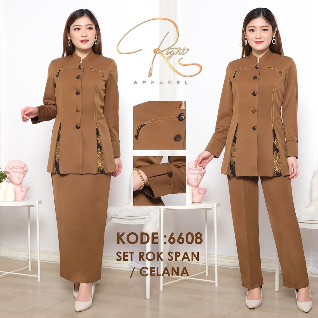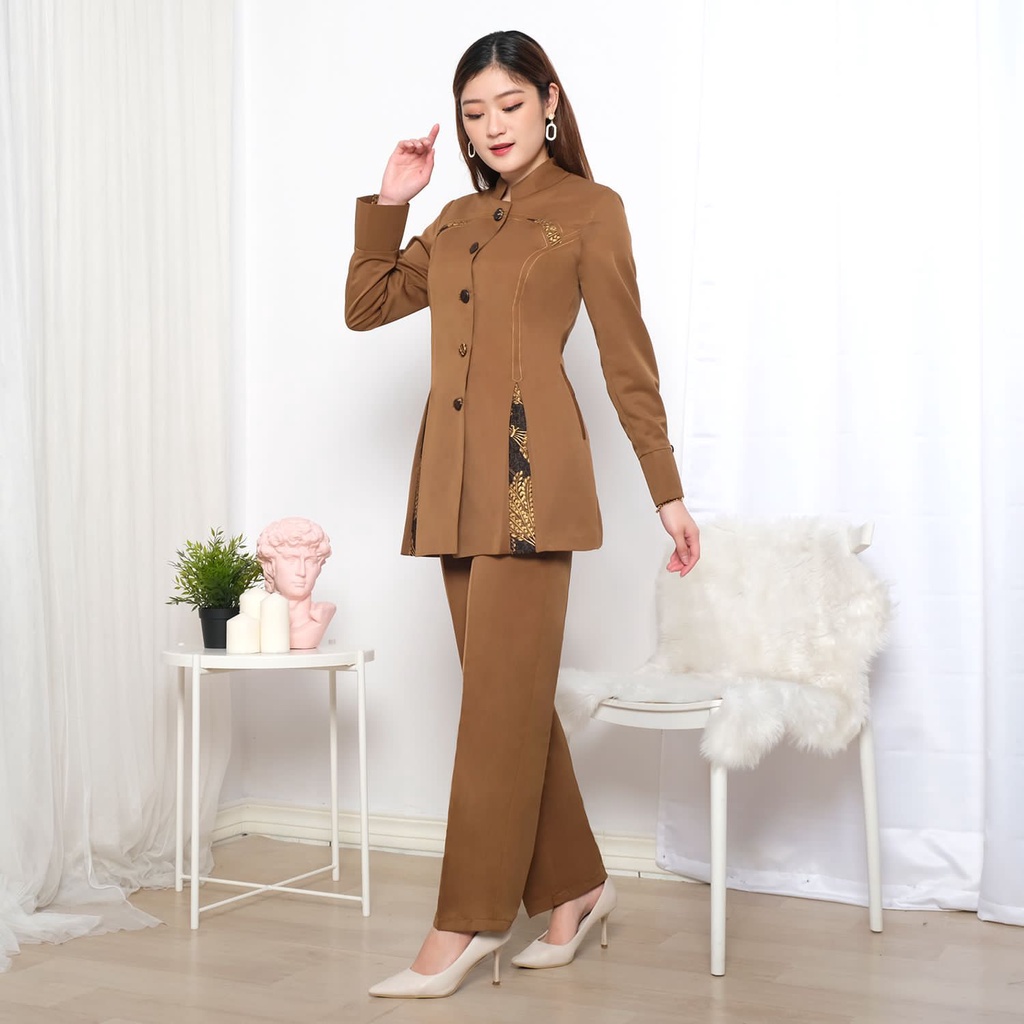 Jas Blazer Wanita Lengan Panjang Detail Variasi Batik Set Celana Panjang / Rok Span Seragam Waskat PDH ASN Coklat Tua /