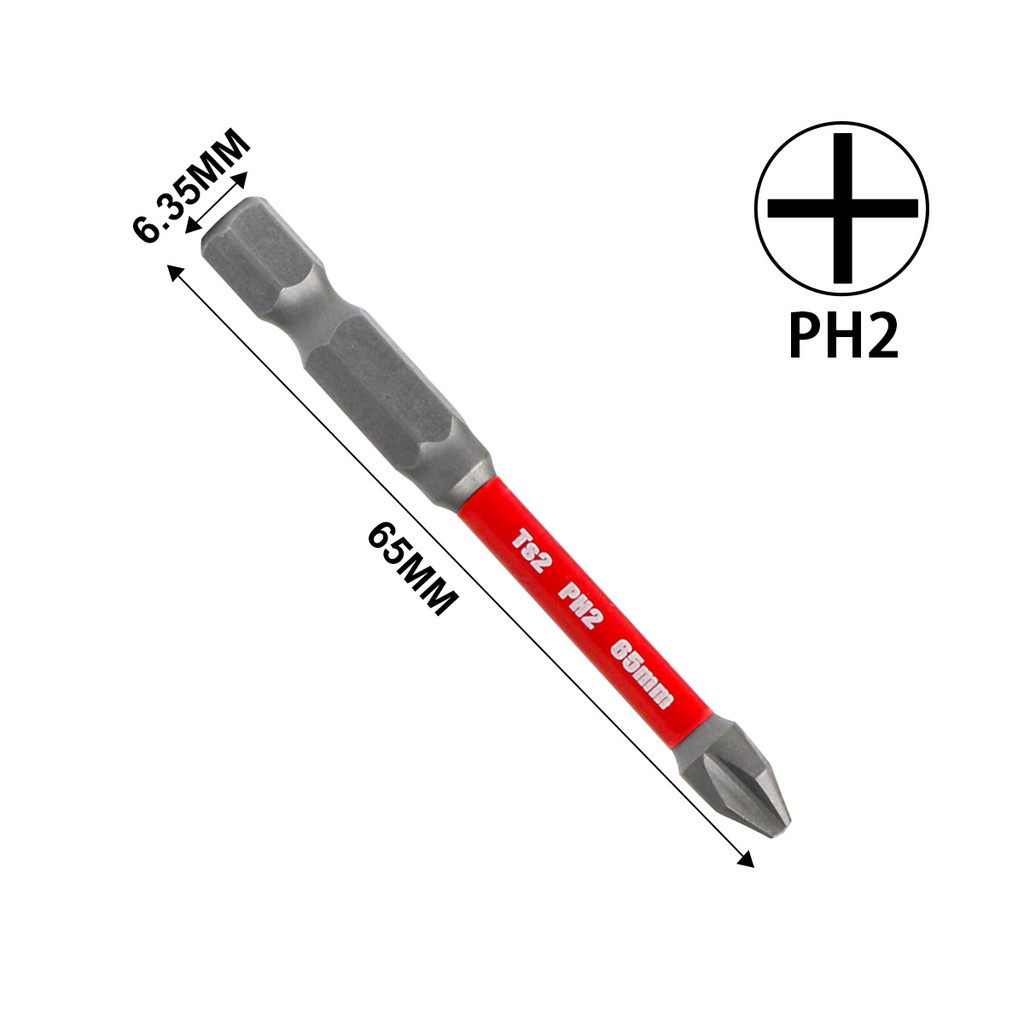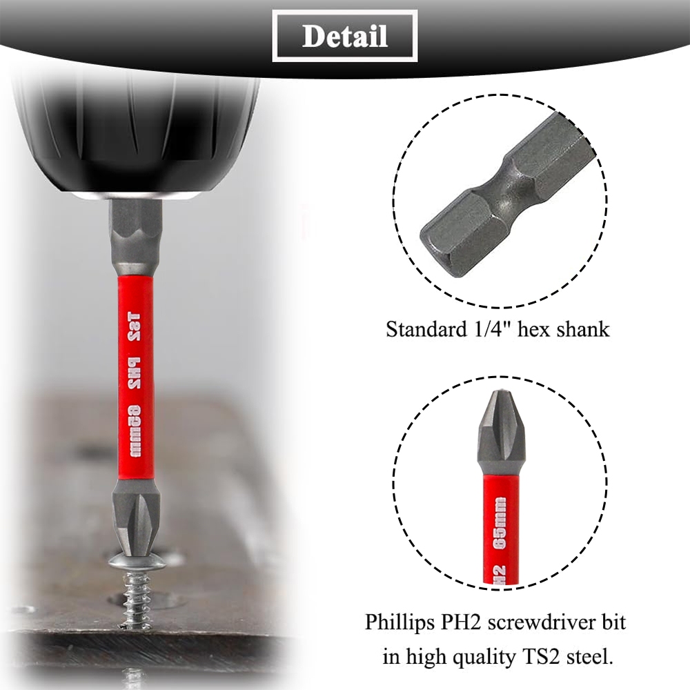 JLD Anti Slip Screwdriver Bit Set 10Pcs PH2 Magnetic 65MM Long TS2 Toolsteel HRC63 1/4 Hex Shank Single Head Bits Screw