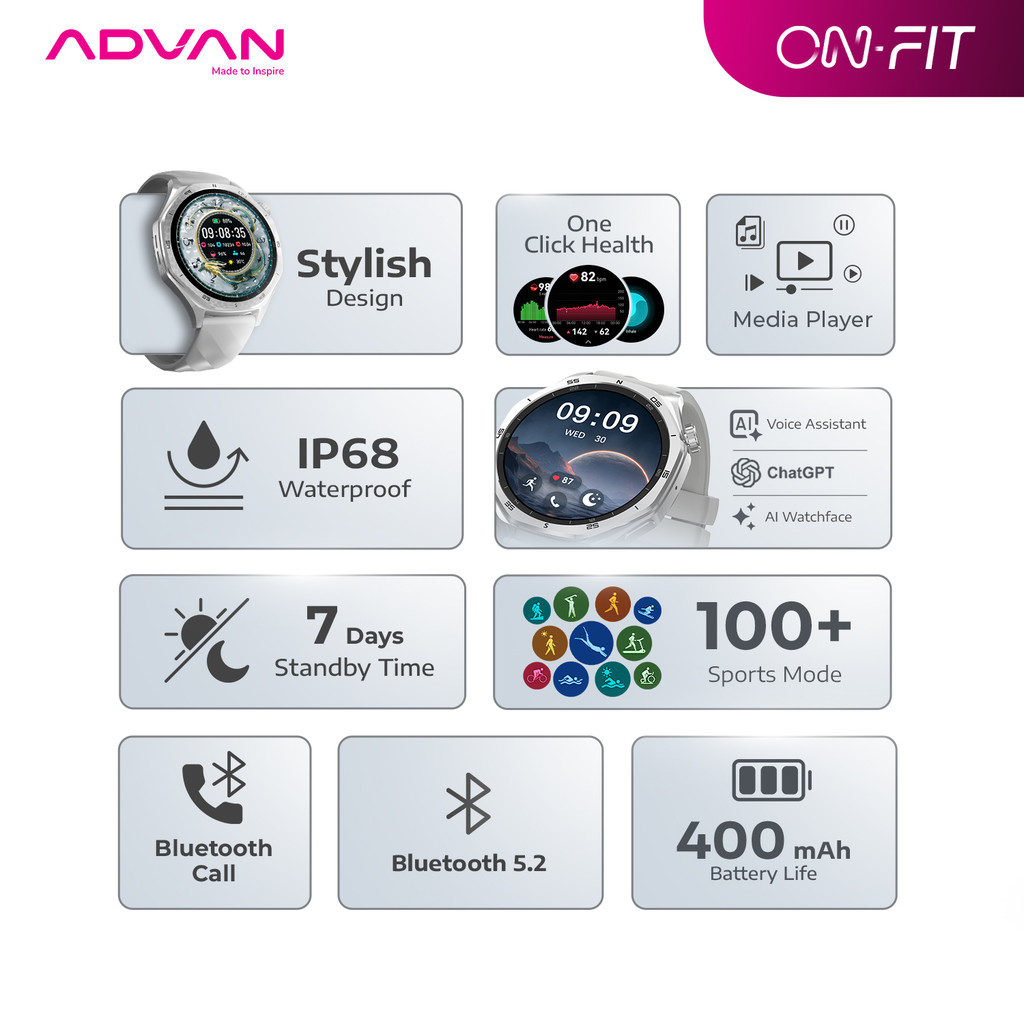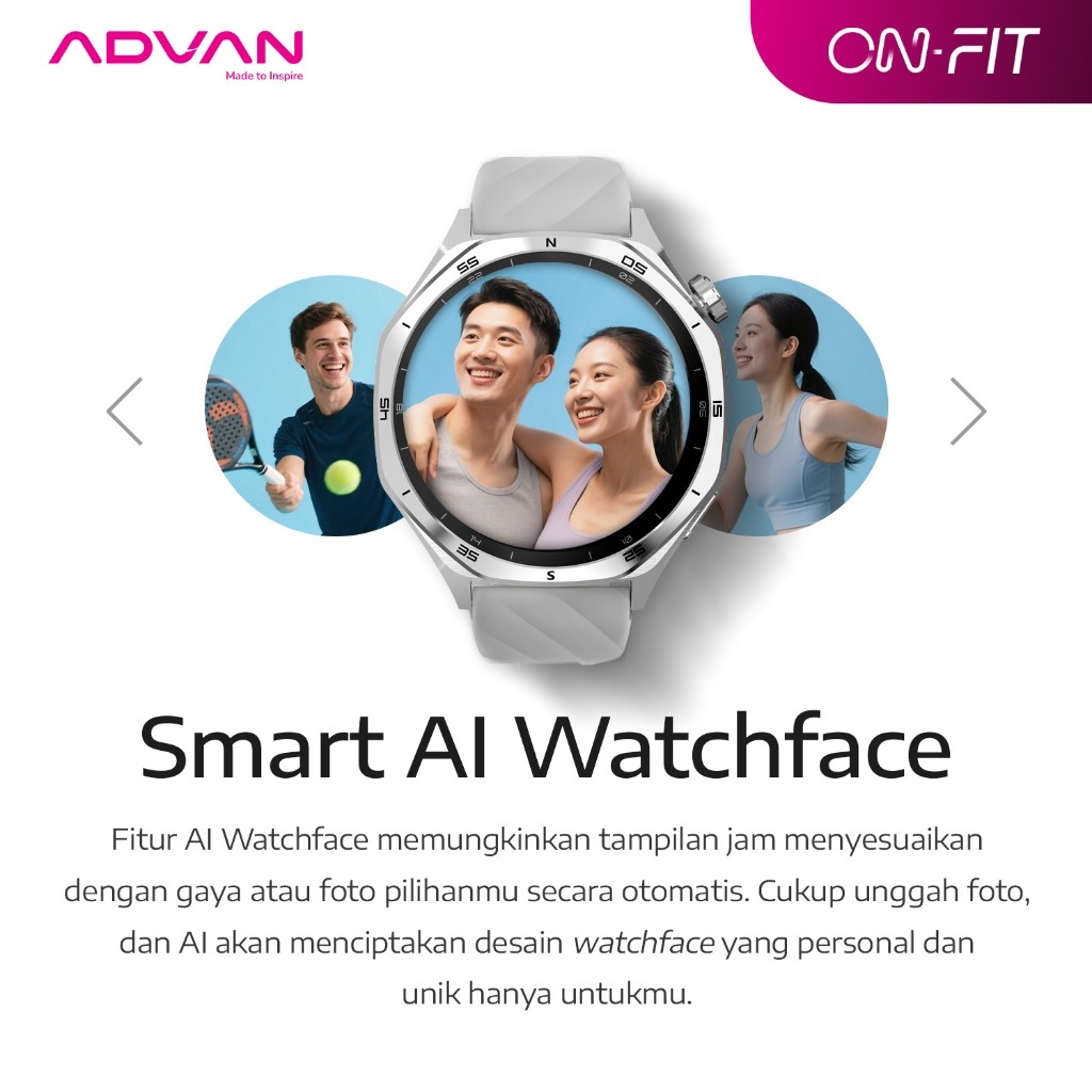 ADVAN Smartwatch On Fit | Jam Tangan Pintar 1.53" inch Display | AI Voice ChatGPT | Strava & Google Fit | 400mAh Battery