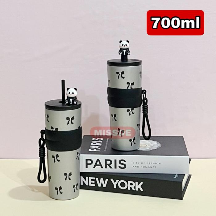 Tumbler 700ml Mug Stainless Steel / Gelas Minum Sedotan / Hot & Cold Mug Panda With Straw Lid - PANDA BLACK