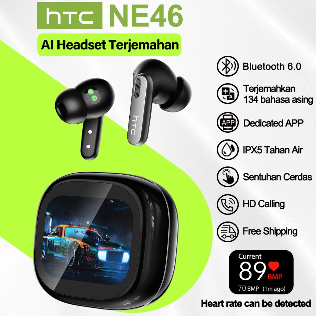 HTC NE46 Headset Terjemahan AI True wireless Bluetooth earphones V6.0 In-Ear earbuds deteksi detak jantung TWS headset gaming Headphone layar sentuh LED tws sport headset olahraga IPX5 HIFI Bass