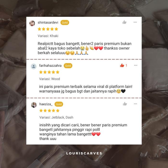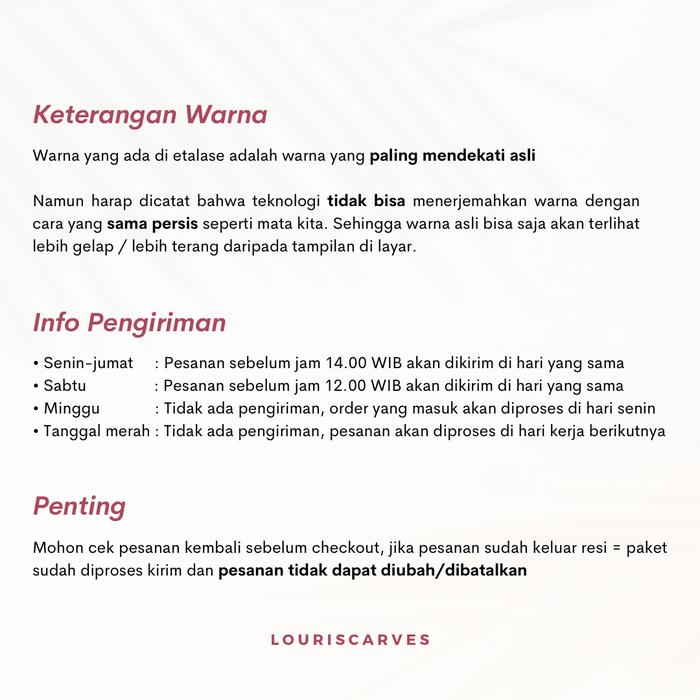 Athena, BW, Carbon, Castrol, Chocopink, Coffee, Coklat Pramuka, Daisy, Dark Jeans, Dash, Evergreen, Flamingo, Forest, Greenery, Irish, Jasmine, Jetblack, Kabuki, Khaki, Latte, Lily, Masami, Matcha, Midgrey, Miggle, Mocca, Mulberry, Navy, Oasis (abu SMA), Pickle, Putih Bersih, Red Ruby, Saloma, Seedpearl, Shell, Shiro, Silverblue, Silvermist, Slate Grey, Smoke Grey, Soft Latte, Space Grey, Stormi, Tally, Tapestry, Turkish, Waffle, Wakana