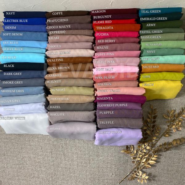Army, Biscuite, Black, Broken White, Burgundy, Caramel, Choco Cream, Choco Mauve, Choco Milk, Coffe, Dark gray, Denim, Dusty Pink, Electrik Blue, Emerald Blue, Emerald Green, Expreso, Flame Red, Flowrest Purple, Fuchia, Hazel, Ice Blue, Ivory, Khaki, Lemon, Light Purple, Lime, Magenta, Maroon, Medium Grey, Mint, Mocca, Moss Green, Mouve, Mustard, Navy, Ocean Blue, Ovaltine, Pastel Green, Pastel Pink, Pink Baby, Pink Peach, Praffuchino, Purpple, Red Berry, Rose Pink, Sage, Sand Latte, Sea Foam, Siena Brown, Silver Grey, SkyBlue, Smoke Gray, Soft Denim, Soft Mint, Sunkist, Sweet Peach, Teal Green, Teracota, Truffle, Umber, Vanila, Walnut, White