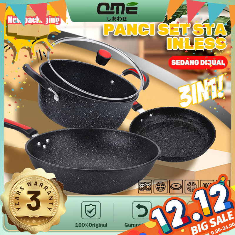 QME Antilengket Peralatan Masak 3PCS Peralatan Dapur Cocok Untuk Semua Kompor Wajan Panci Paket Keluarga Set
