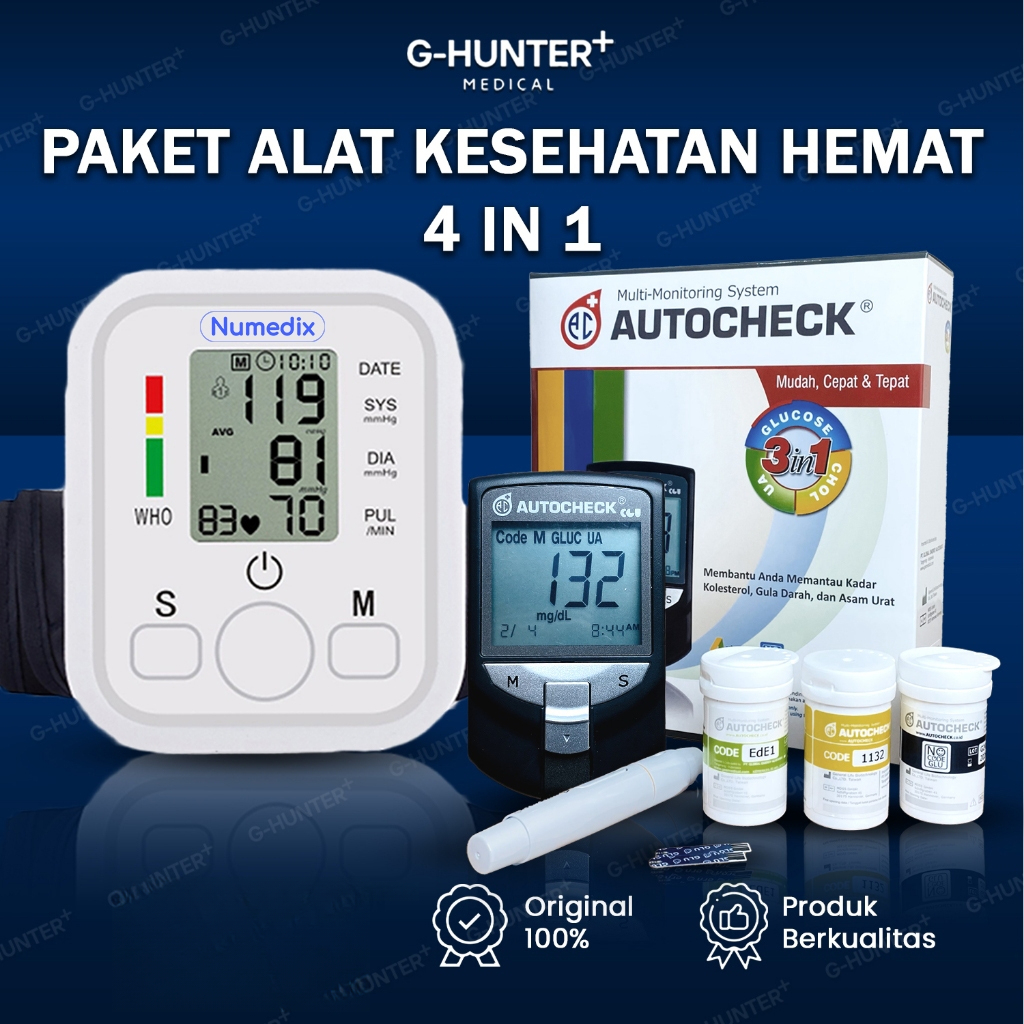 Paket Bundling 4 In 1 Tensimeter Digital Dan Autocheck / Autocheck 3 In 1 Mesin Alat Cek Gula Darah Kolestrol Asam Urat