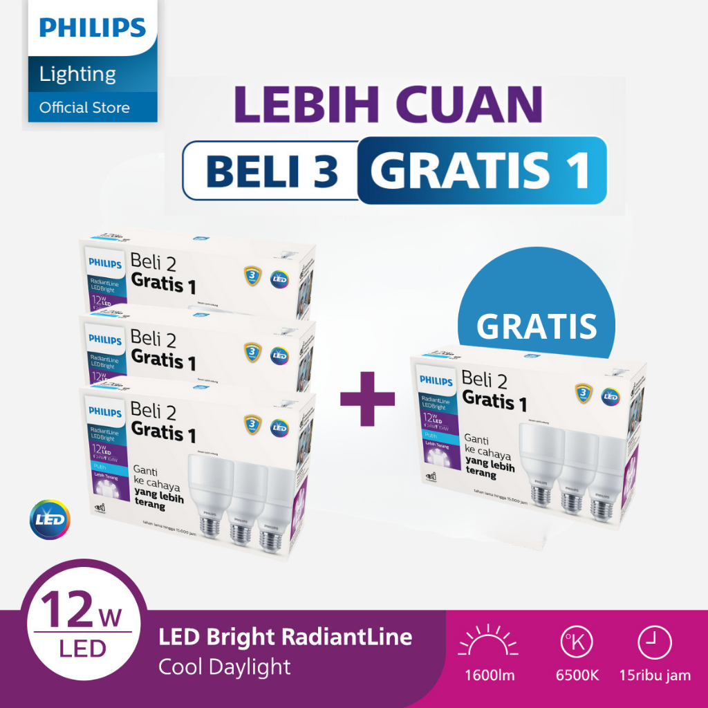 Philips Paket Beli 3 Gratis 1 Lampu Multipack Radiantline LED Bright 12W 6500K Putih