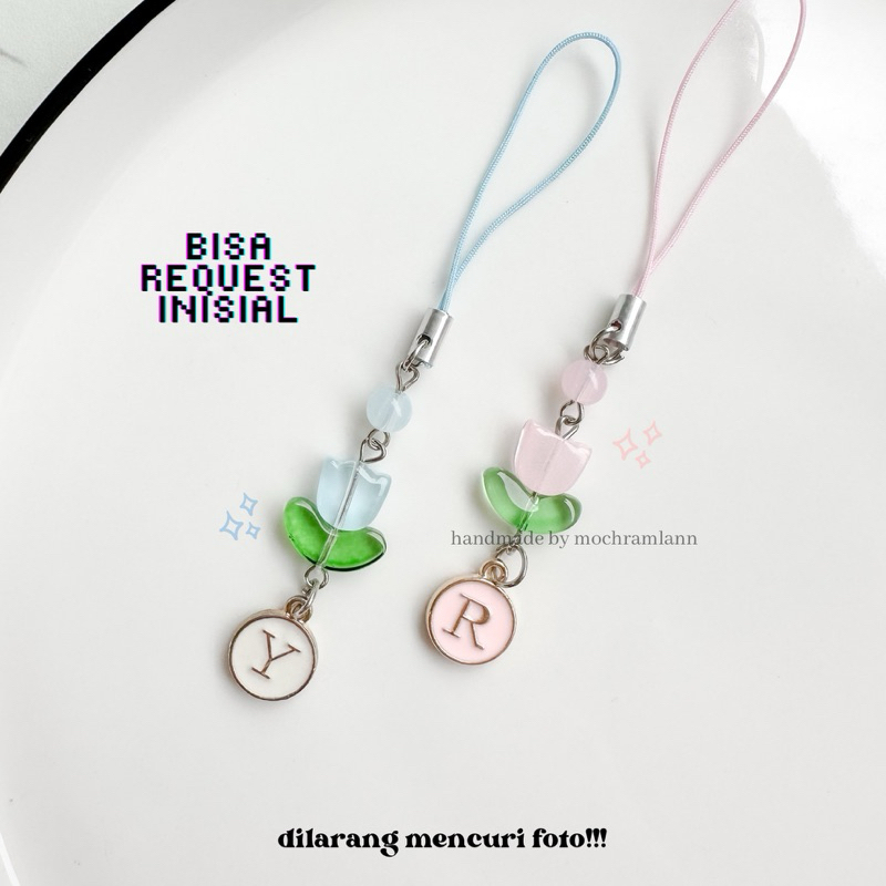 Strap Hp Cute Flower Tulips Pink & Inisial / Strap Liontin Cute Best Seller / Tali Gantungan Hp Flashdisk Dll Aesthetic