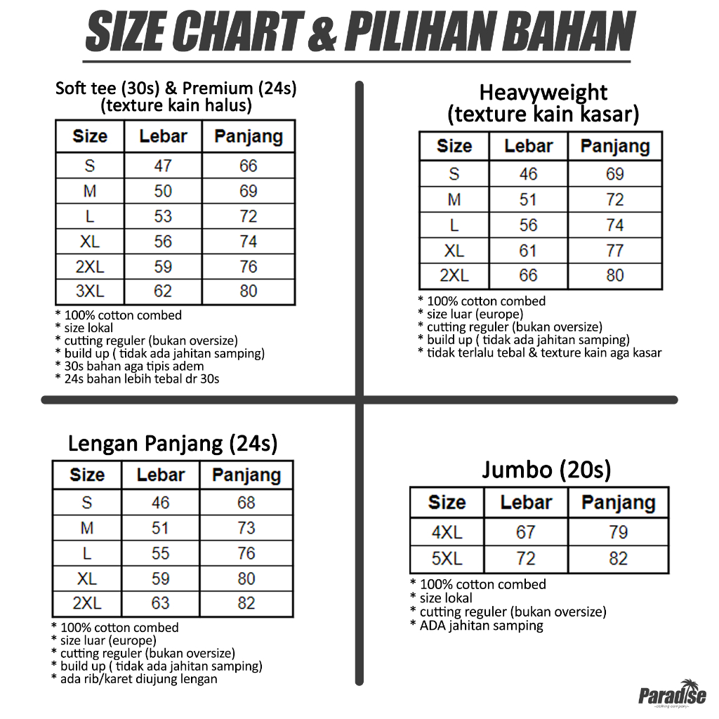 Soft Tee 30s, Premium 24s, Heavyweight, Jumbo, Lengan panjang 24s