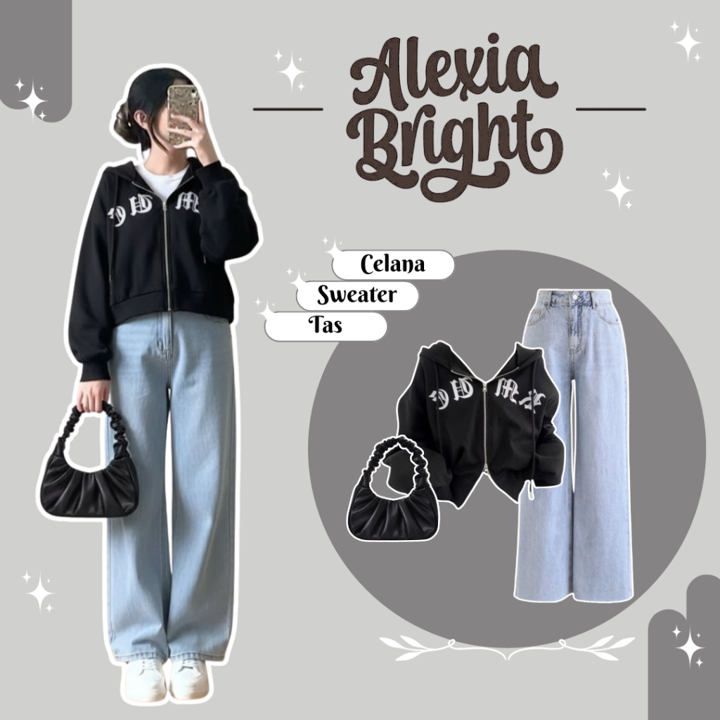 One Set Wanita Korean Style Kekinian | Hoodie Crop + Celana Denim + Tas Centik | Outfit Skena Kalcer RF193 GU