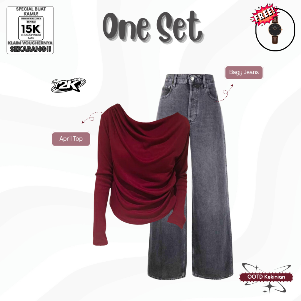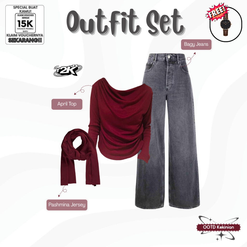 RN-117 | One Set Wanita Kekinian ( April Top + Jeans Kulot + Pashmina Jersey ) Outfit Kalcer Y2K