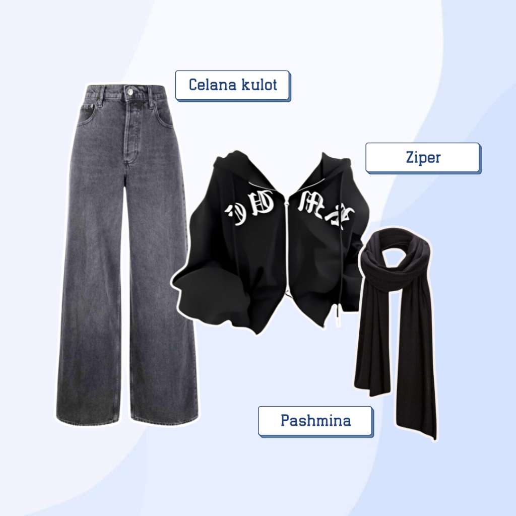 3in1 One Set Wanita Korean Style Jacket Ziper Celana Kulot Jeans Highwaist Pashmina Kaos Jersey BK45