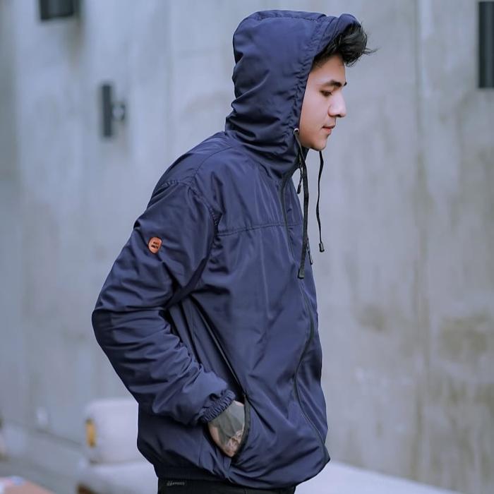 Jaket Cowok Parasut Pria Waterproof Hoodie Anti Air Outdoor Parasit Distro - Hitam Polos, M
