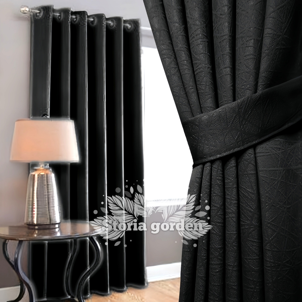 Gorden Blackout Polos Jendela Minimalis Pintu Tinggi Hordeng 12 Lubang Ring 6 Gelombang Warna Hitam