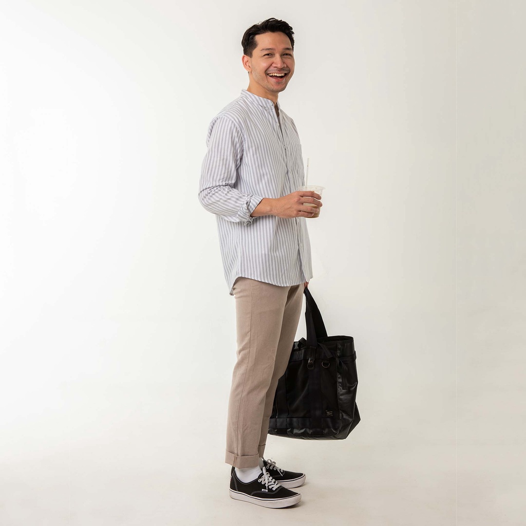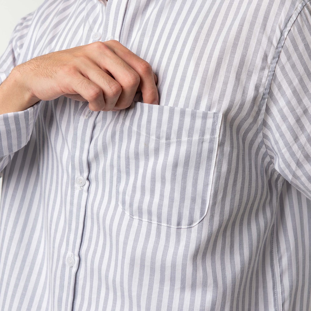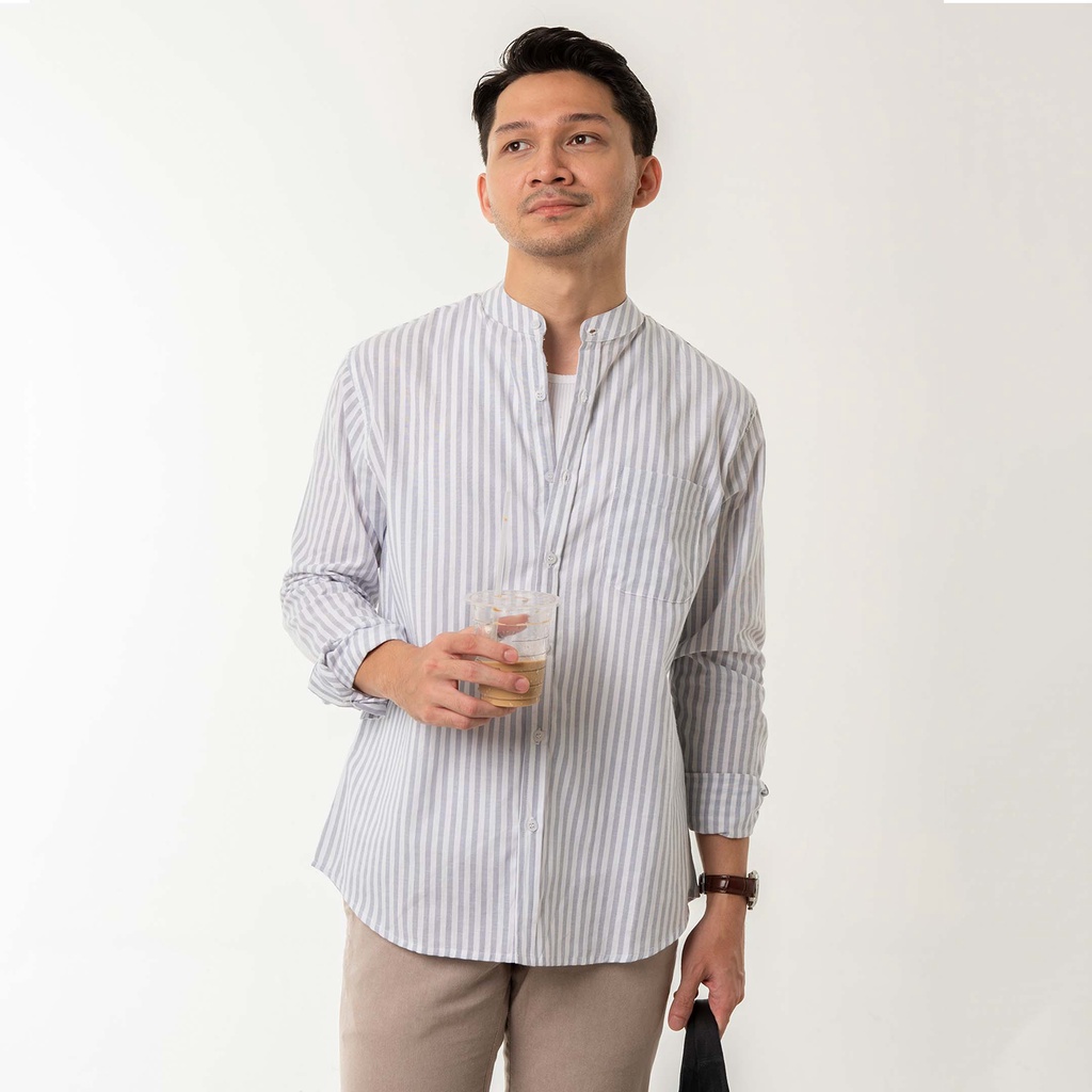 Kemeja Pria Garis Woodcutter Collarless Butcher Stripe Kerah Shanghai - Light Grey Lengan Panjang