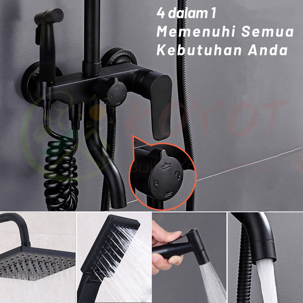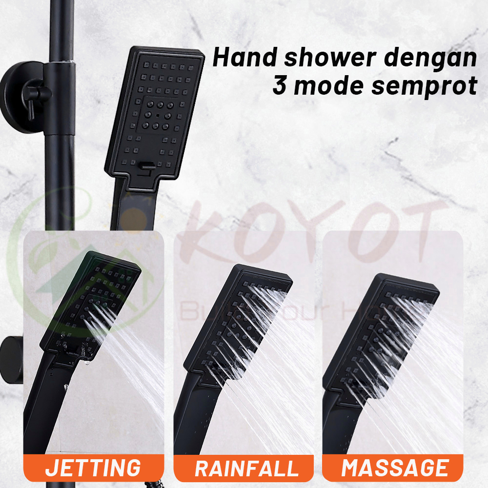 KOYOT 4 Dalam 1 Shower Kamar Mandi Full Set Panas Dingin Persegi Hitam Matte dengan Mixer Panas Dingin 4 Ways / Jet Show