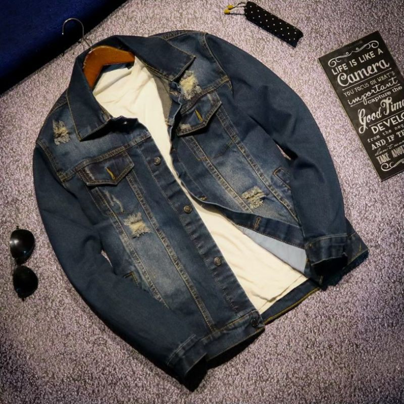 Logo Gm -Jaket Jeans Pria Sobek Bahan Tebal Tidak Luntur Premium Jaket Jeans Cowok Oversize