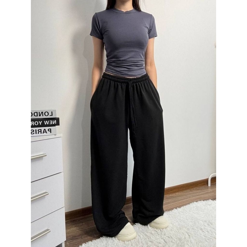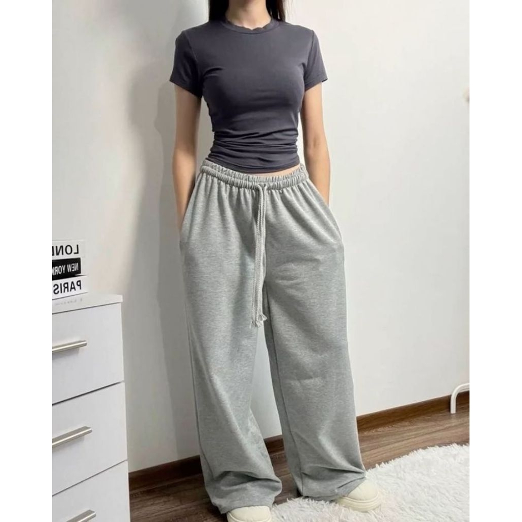 Celana Katun Panjang Wanita Skena Wide Leg Black Wishker Basic Baggy Pants Lebar Gombrong Hitam Pria Lost Fit Jumbo Big