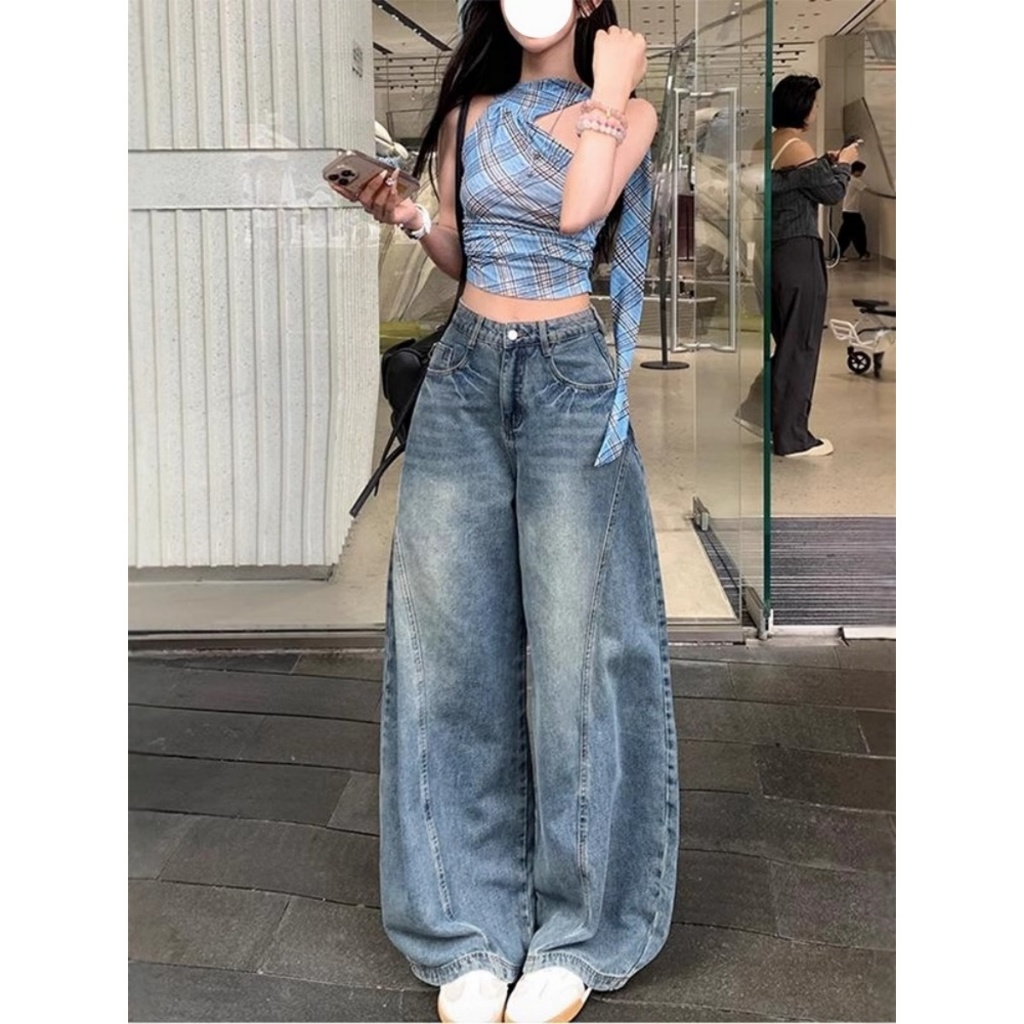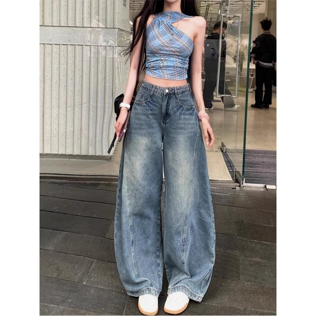 lulu jeans-Biru Retro Highwaist koult Celana Jeans Wanita baggy baggy Jeans Korean--Celana panjang yang besar--Cocok unt