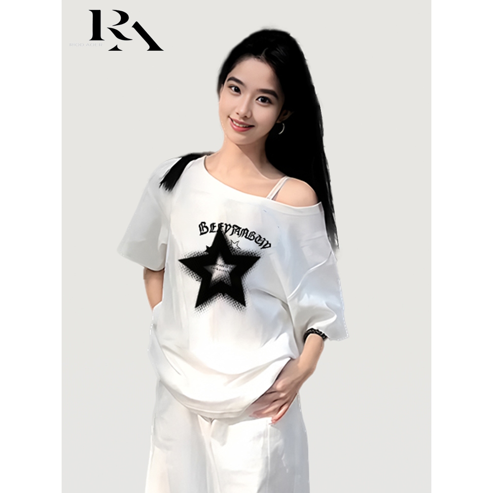 KAOS YK2 LENGAN PENDEK BAHU MIRING CETAK AMERIKA WANITA MUSIM PANAS 2025 BARU RETRO KASUAL LONGGAR