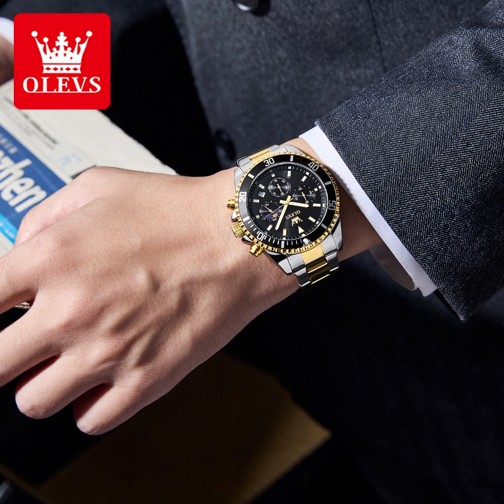 Olevs Jam Tangan Pria Anti Air Original Tahan Keren Luxury Led Analog Stainless Steel Chronograph Watch Men Hitam Model